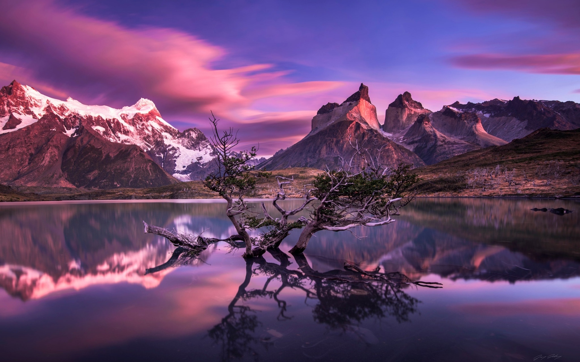 Description: A tree is in the water with mountains in the background at sunset with a pink sky and clouds reflected in the water.