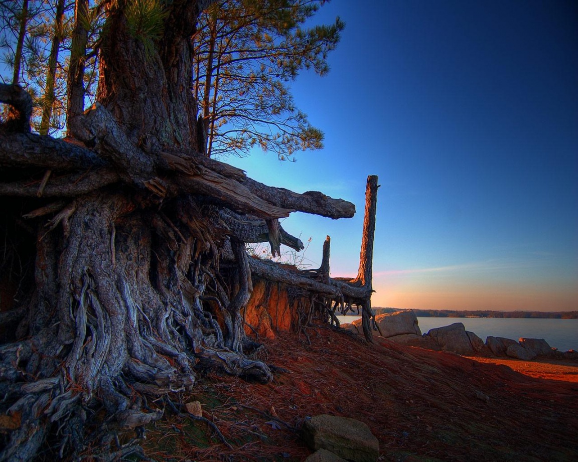 Description: A tree that is sitting on the ground near water and rocks and a sky background with a few clouds.