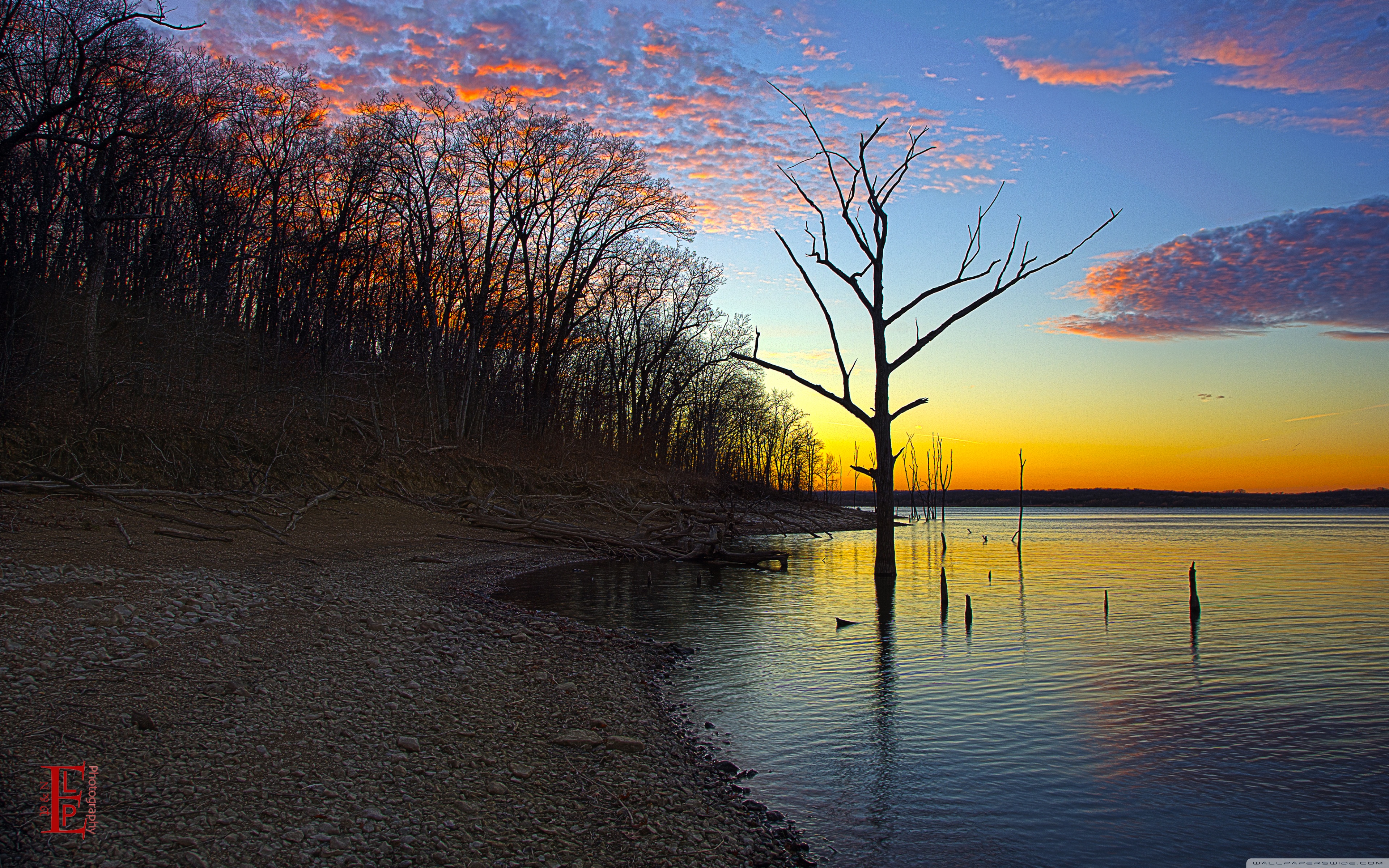 Description: A tree is standing in the water at sunset or dawn on a lake shore with a few boats in the water.