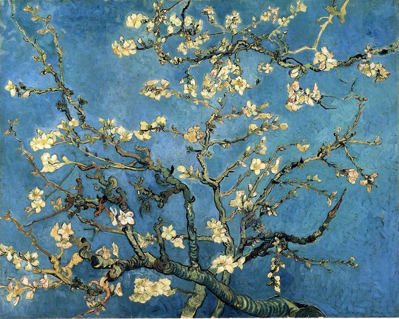 Description: A painting of a tree with white flowers on it's branches and a blue background with a sky.