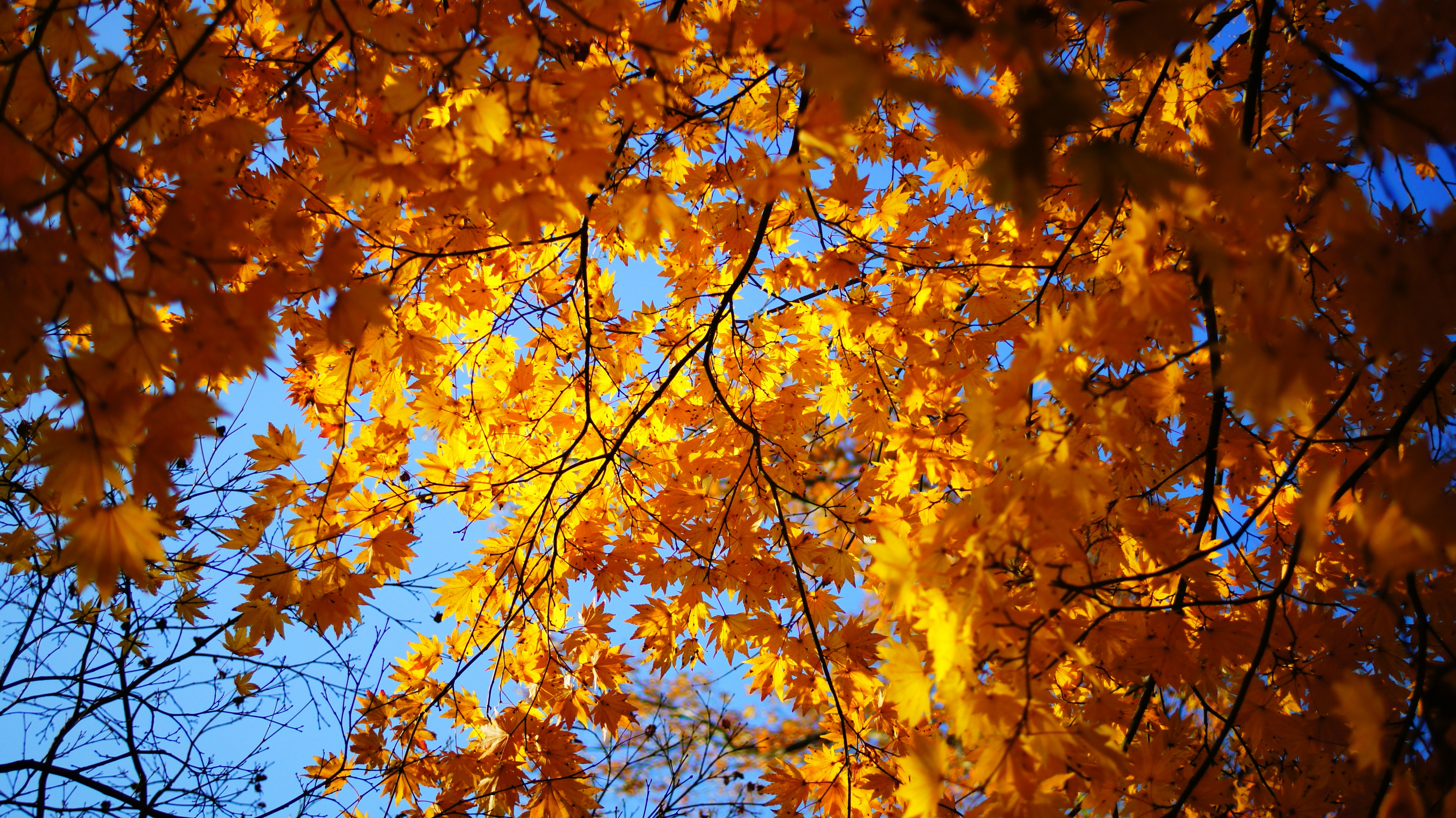 Description: A tree with yellow leaves and blue sky in the background with a few clouds in the sky above it.