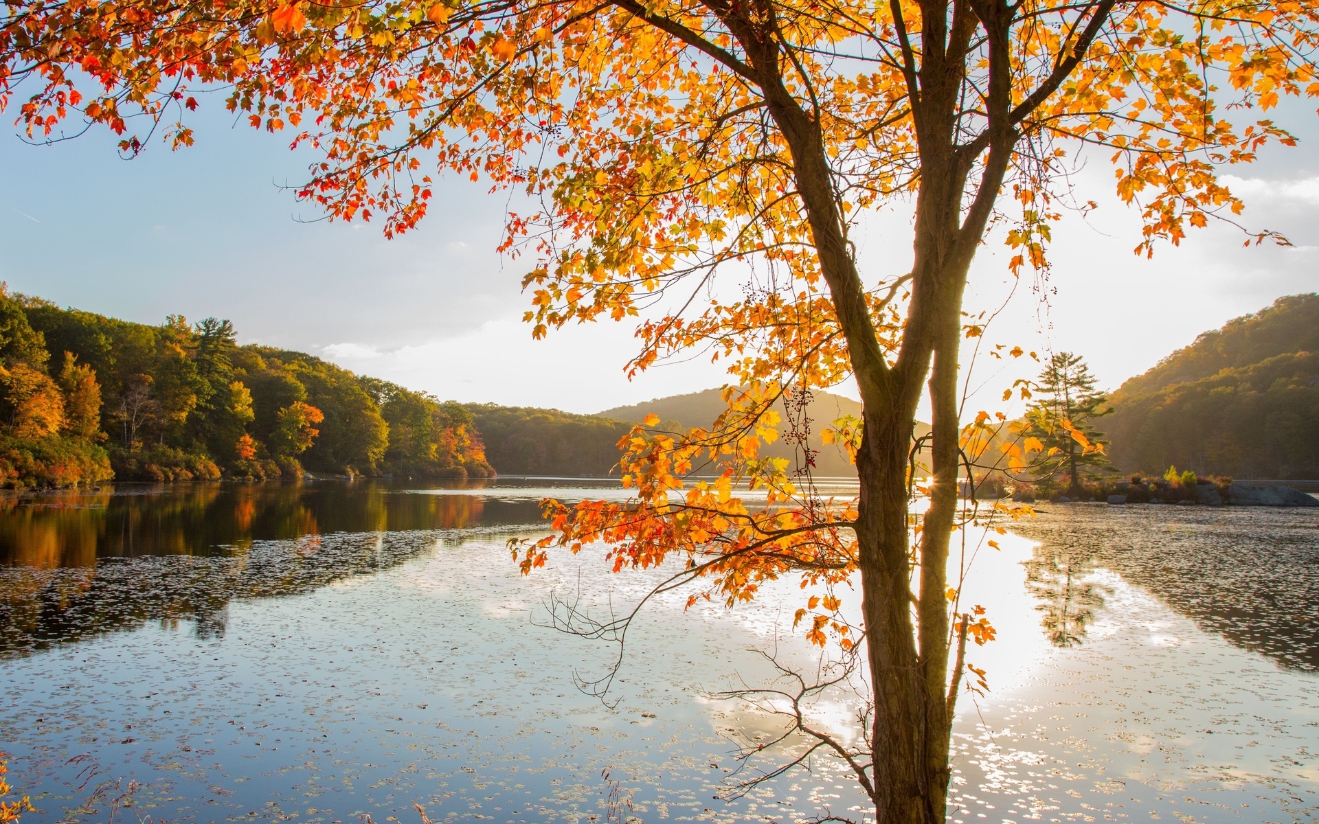 Description: A tree with yellow leaves near a body of water with a mountain in the background and a few clouds in the sky.