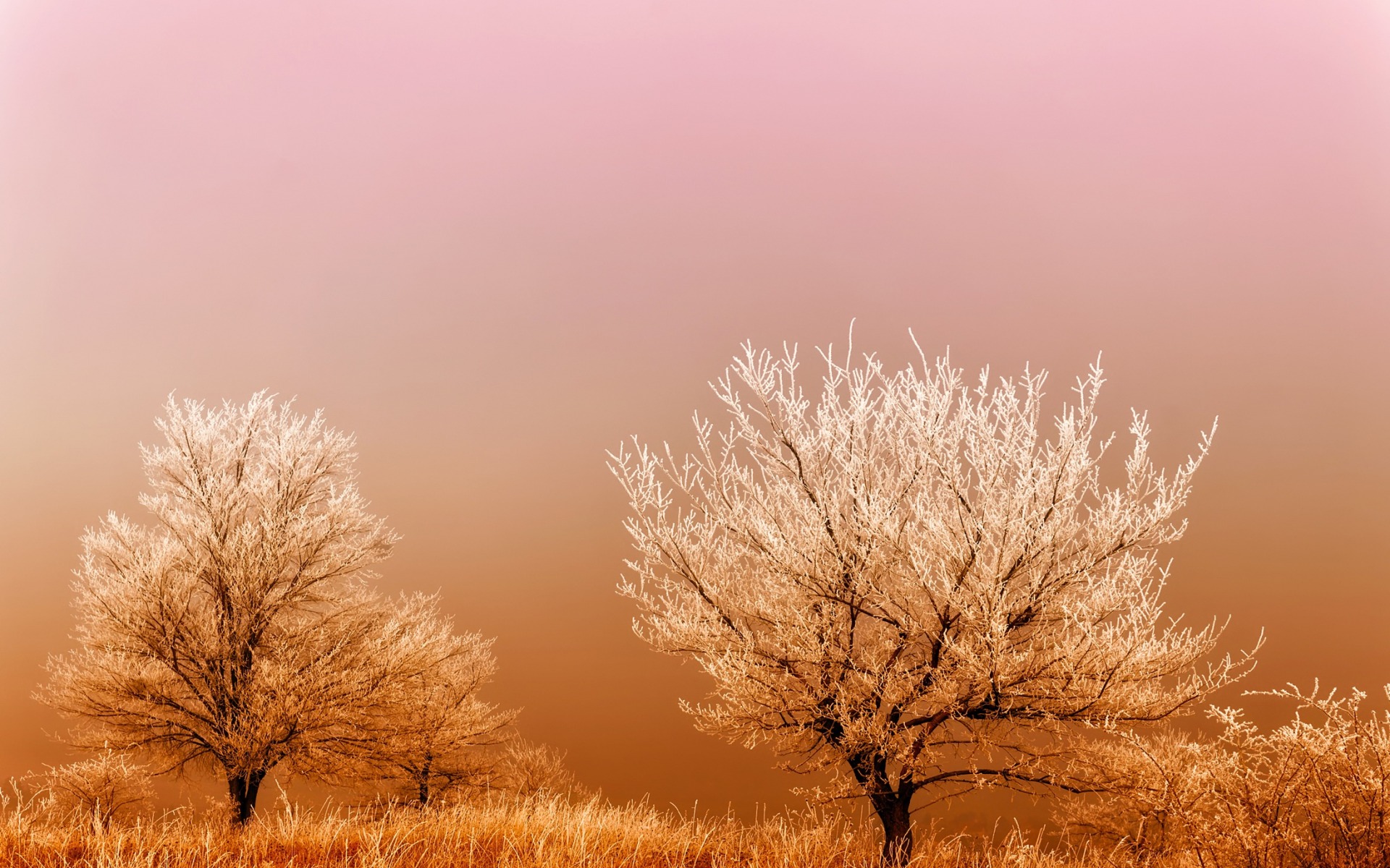 Description: Two trees in a field with a pink sky in the background and a brown sky in the background with a few clouds.