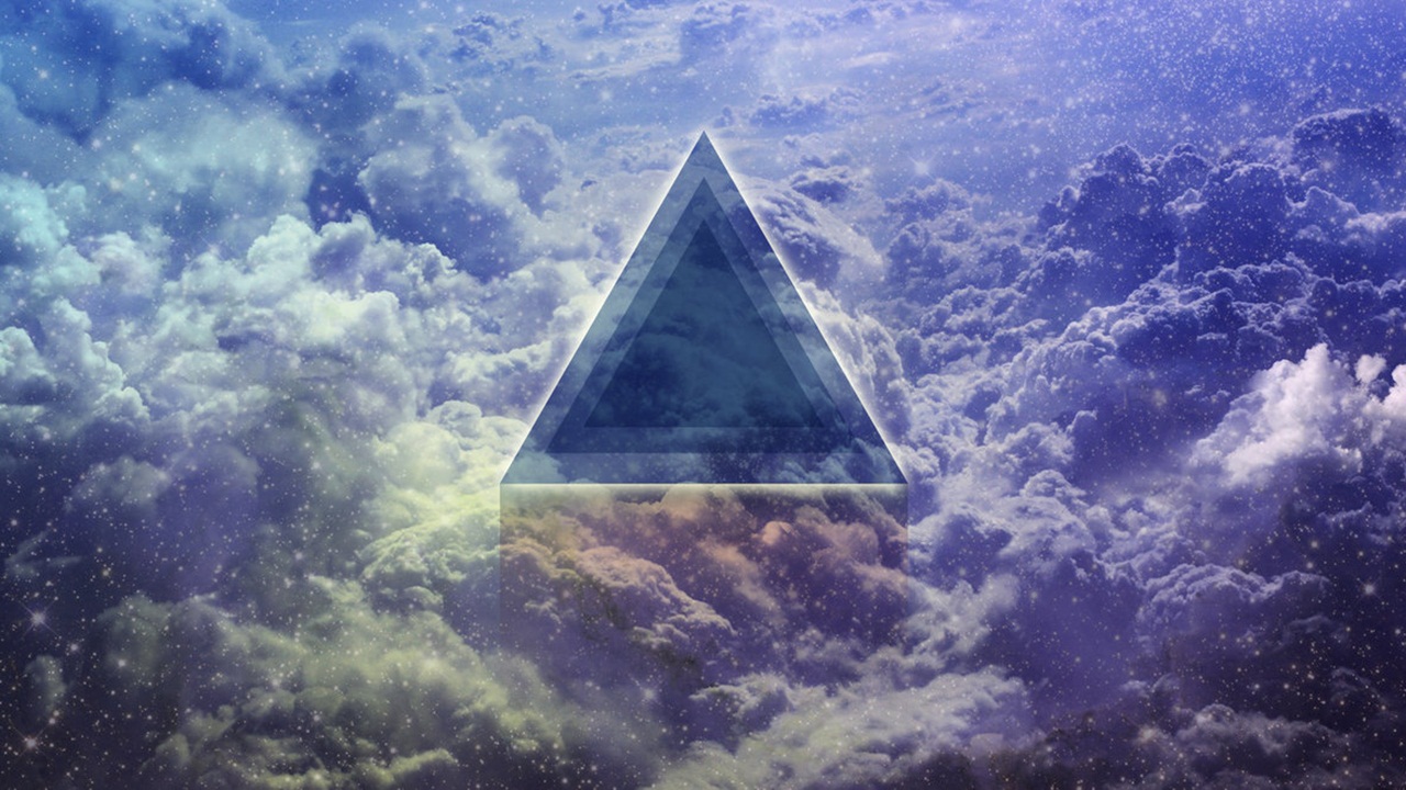 Description: A triangle in the clouds with a sky background with stars and clouds below it.