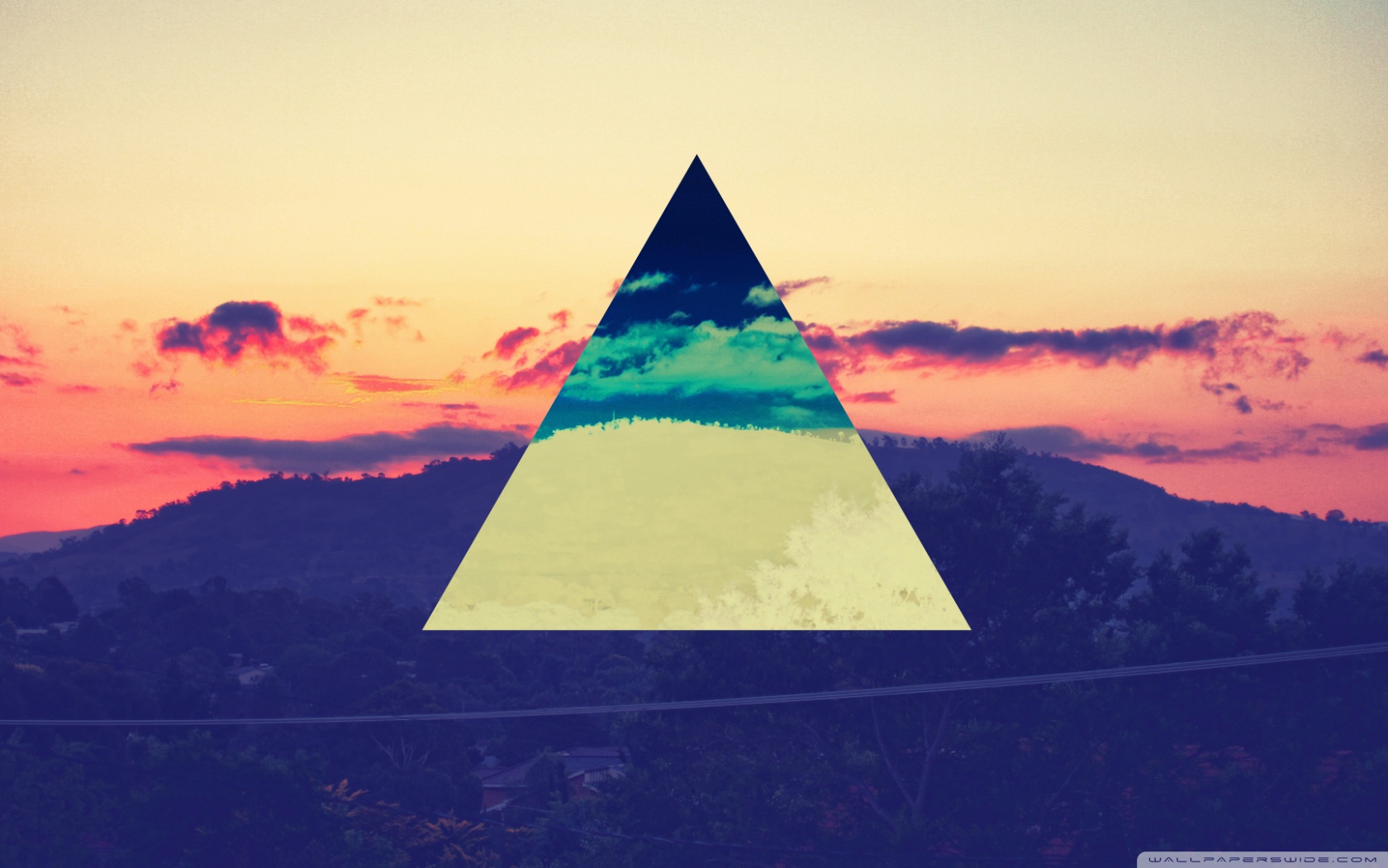 Description: A triangle shaped object in the middle of a sunset sky with a mountain in the background and clouds in the sky.
