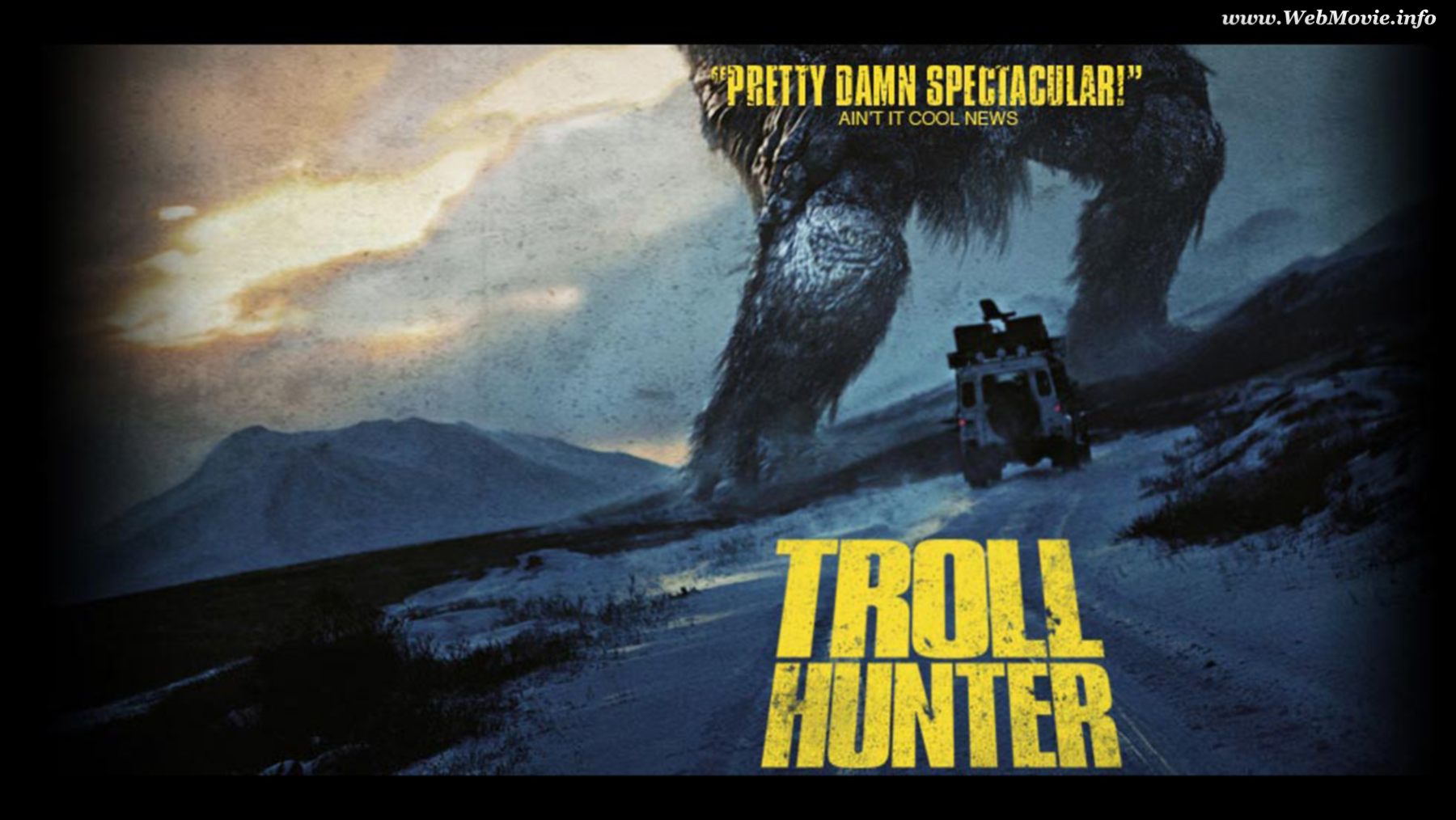 Description: A movie poster for troll hunter with a giant monster in the background and a car in the foreground.
