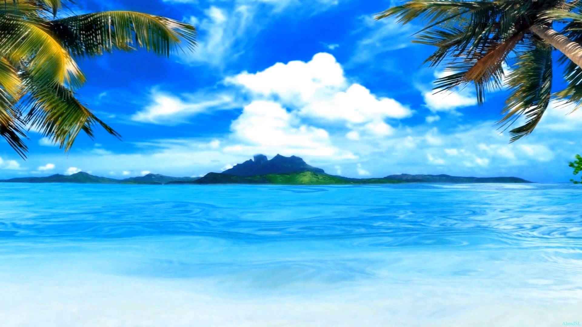 Description: A painting of a tropical beach with palm trees and a mountain in the distance with a blue sky and clouds.