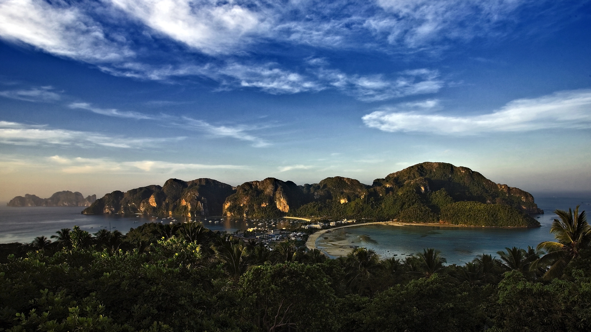 Description: A beautiful view of a tropical island with a beach and a pier in the distance with a blue sky.