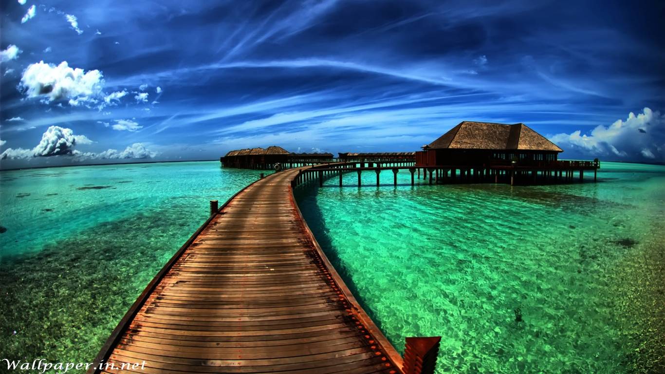 Description: A pier leading to a hut on a tropical island with clear water and a blue sky with clouds above.