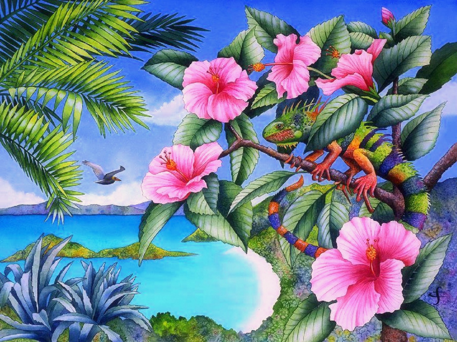 Description: A painting of a tropical scene with flowers and a bird flying over the water and a bird on a branch.