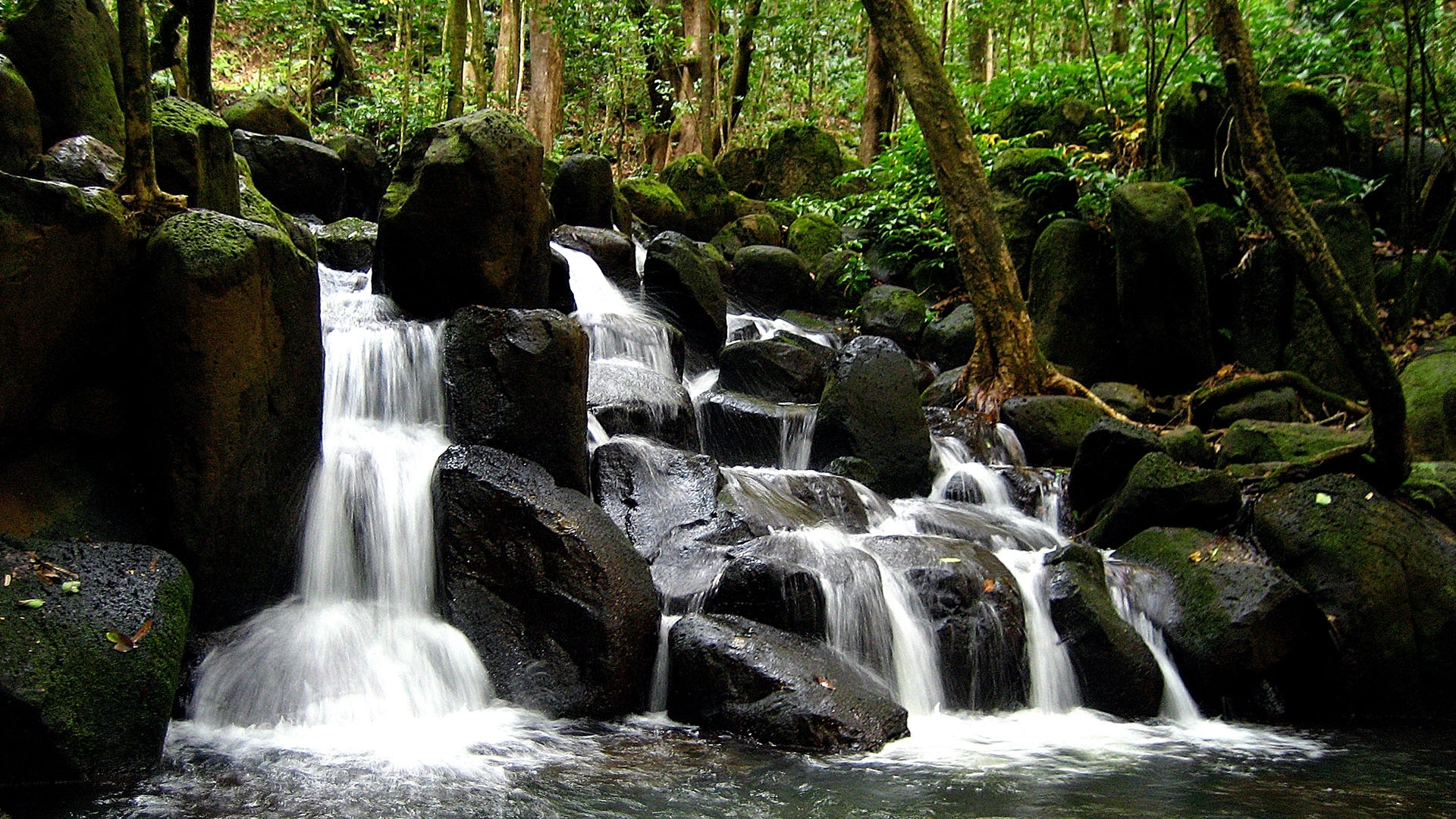 Description: A waterfall in a tropical forest with rocks and trees around it and water running down the side of it.