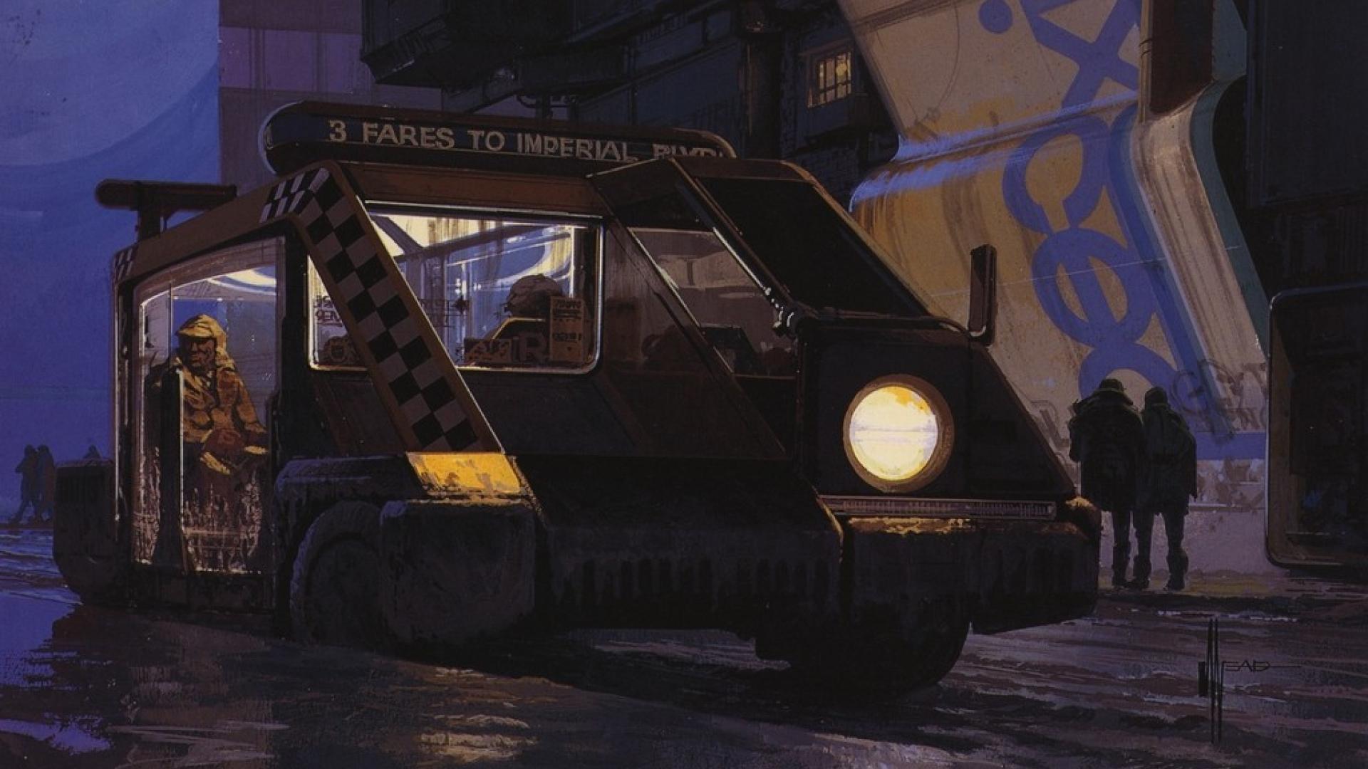 Description: A painting of a truck with a checkered front and a man standing next to it on a city street.