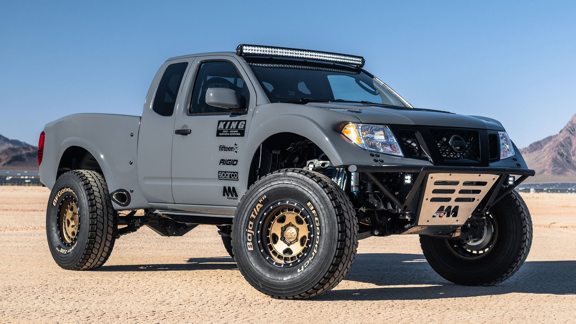 Description: A truck with a light on it parked in the desert with mountains in the background and a blue sky.