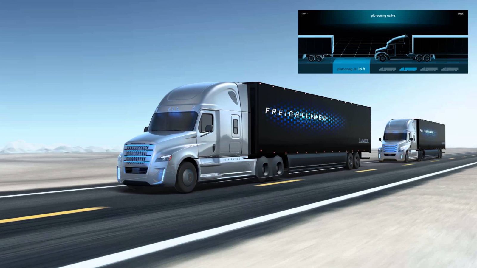 Description: A truck driving down a highway next to another truck on the road with a sky background and a car on the road.