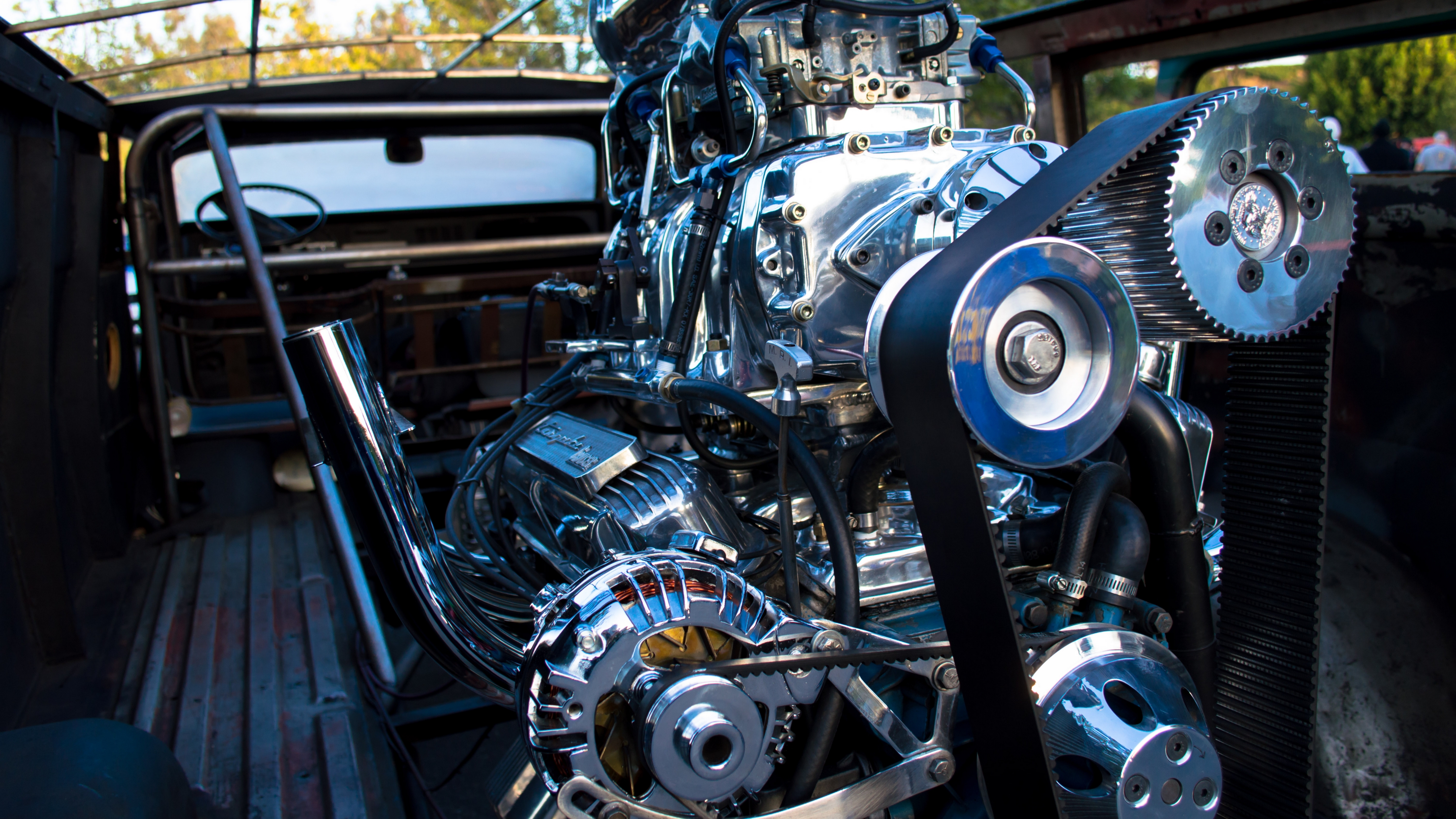 Description: A close up of a truck engine with a gear belt attached to it's center piece and a truck in the background.