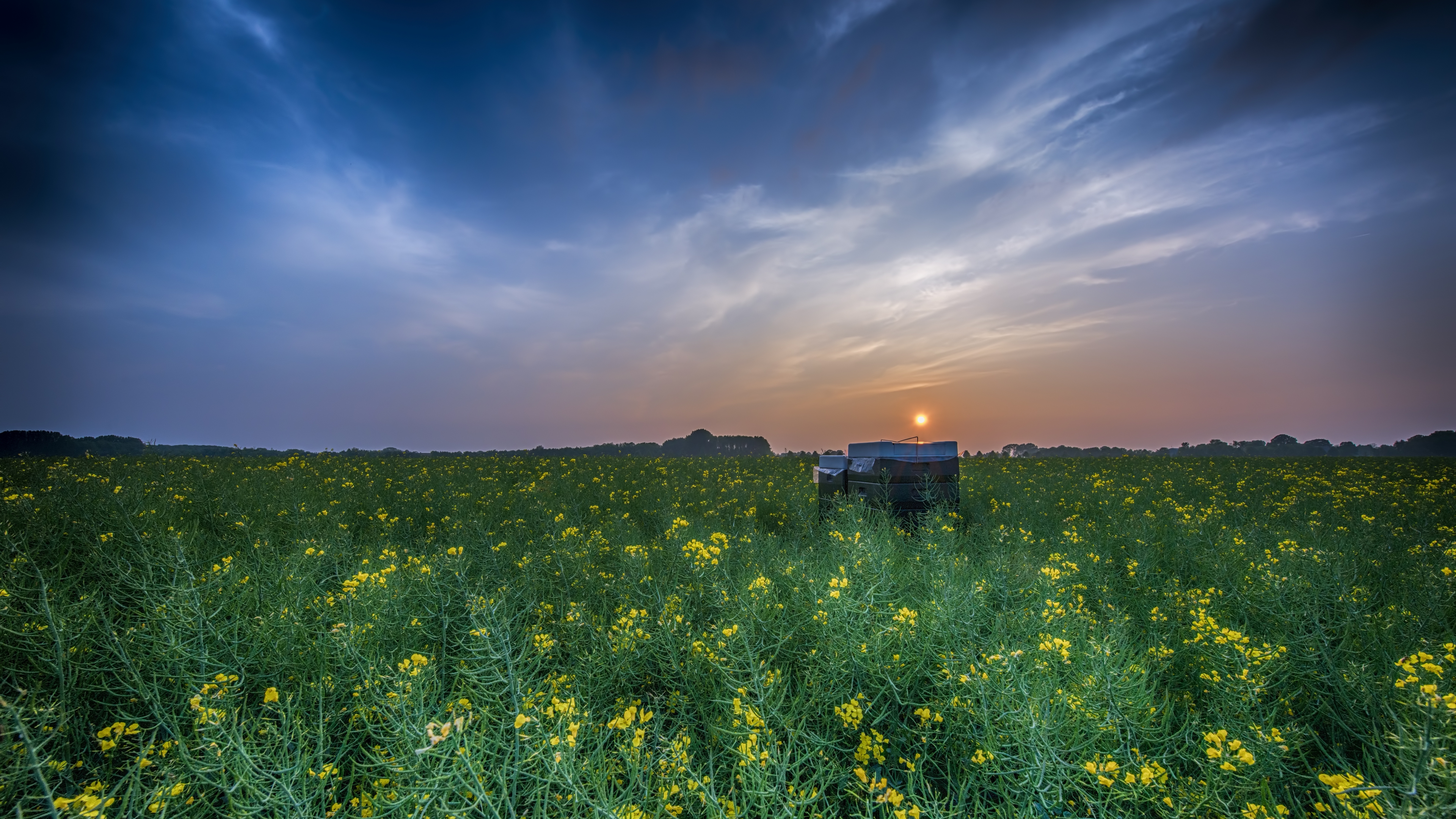 Description: A truck is parked in a field of flowers at sunset or dawn with the sun setting behind the clouds.