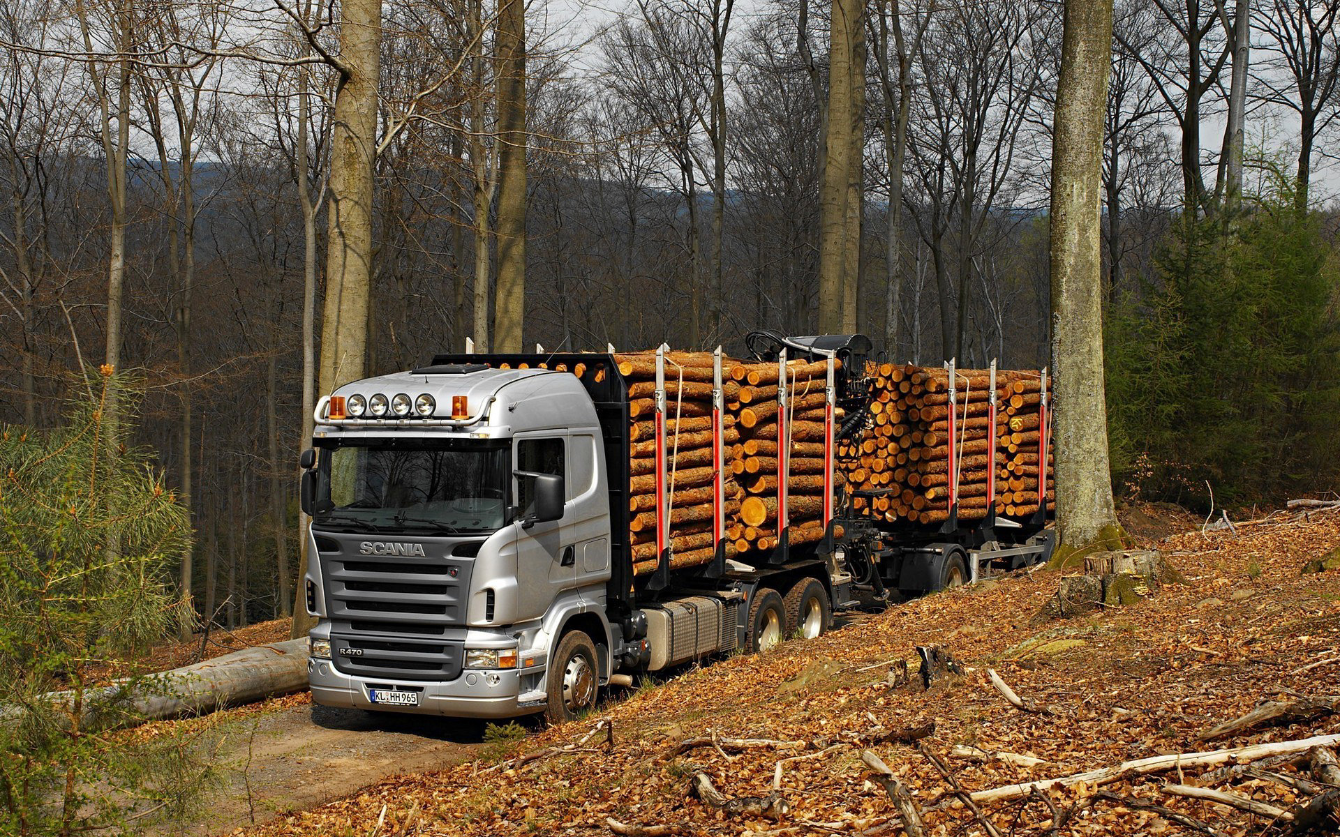 Description: A truck is hauling logs down a dirt road in the woods on a cloudy day with no one around.