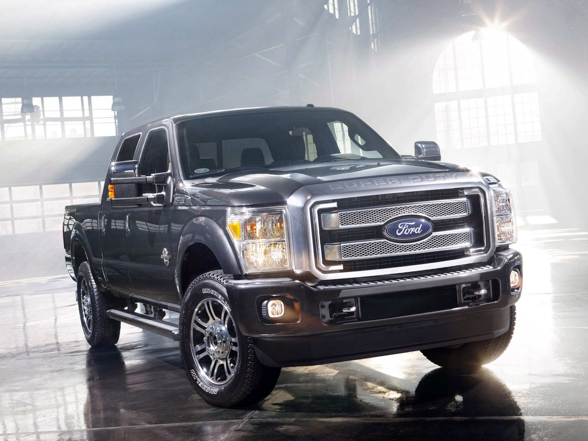 Description: A truck is parked in a large room with a light shining on it's side and the front end of the truck.