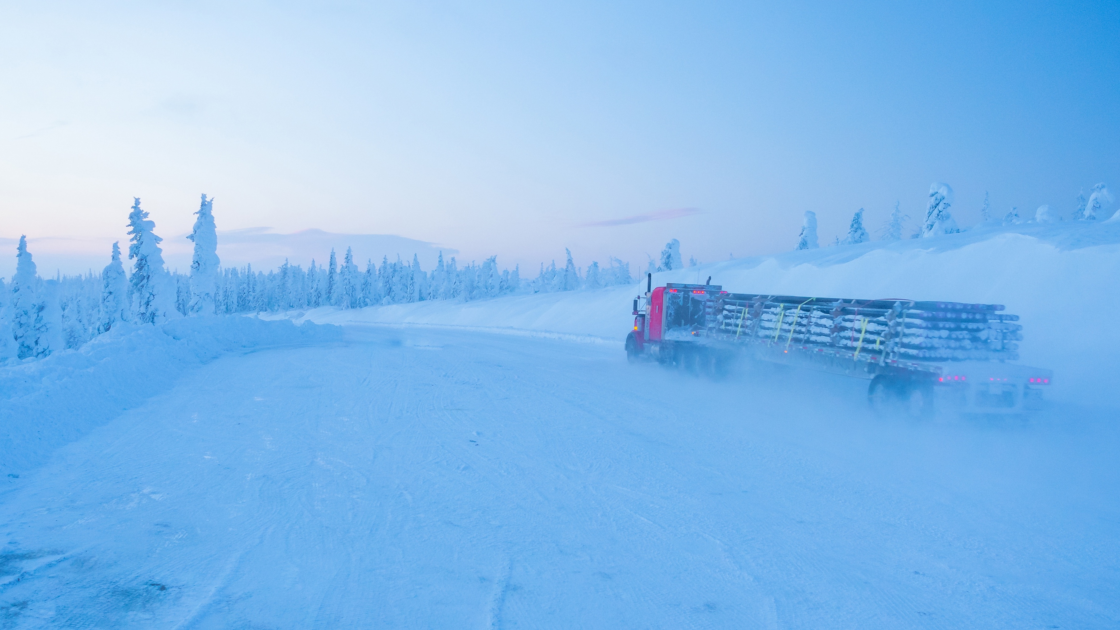 Description: A truck driving down a snow covered road in the middle of the woods and trees in the background.