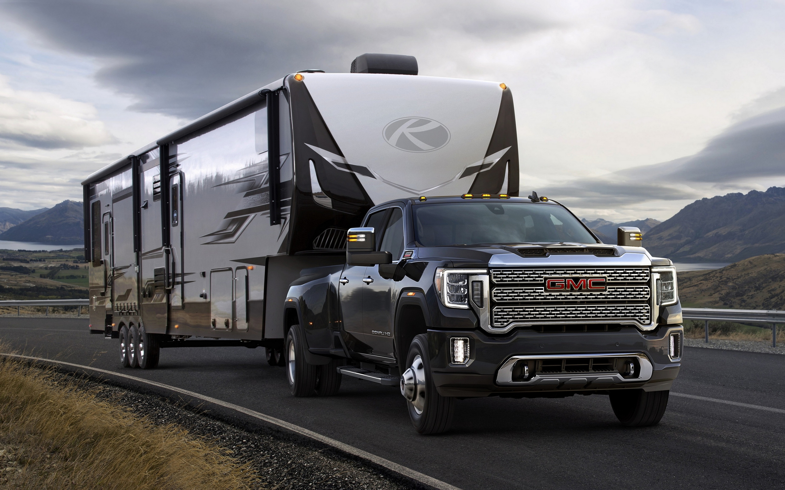 Description: A truck towing a trailer on a highway with mountains in the background and clouds in the sky above it.