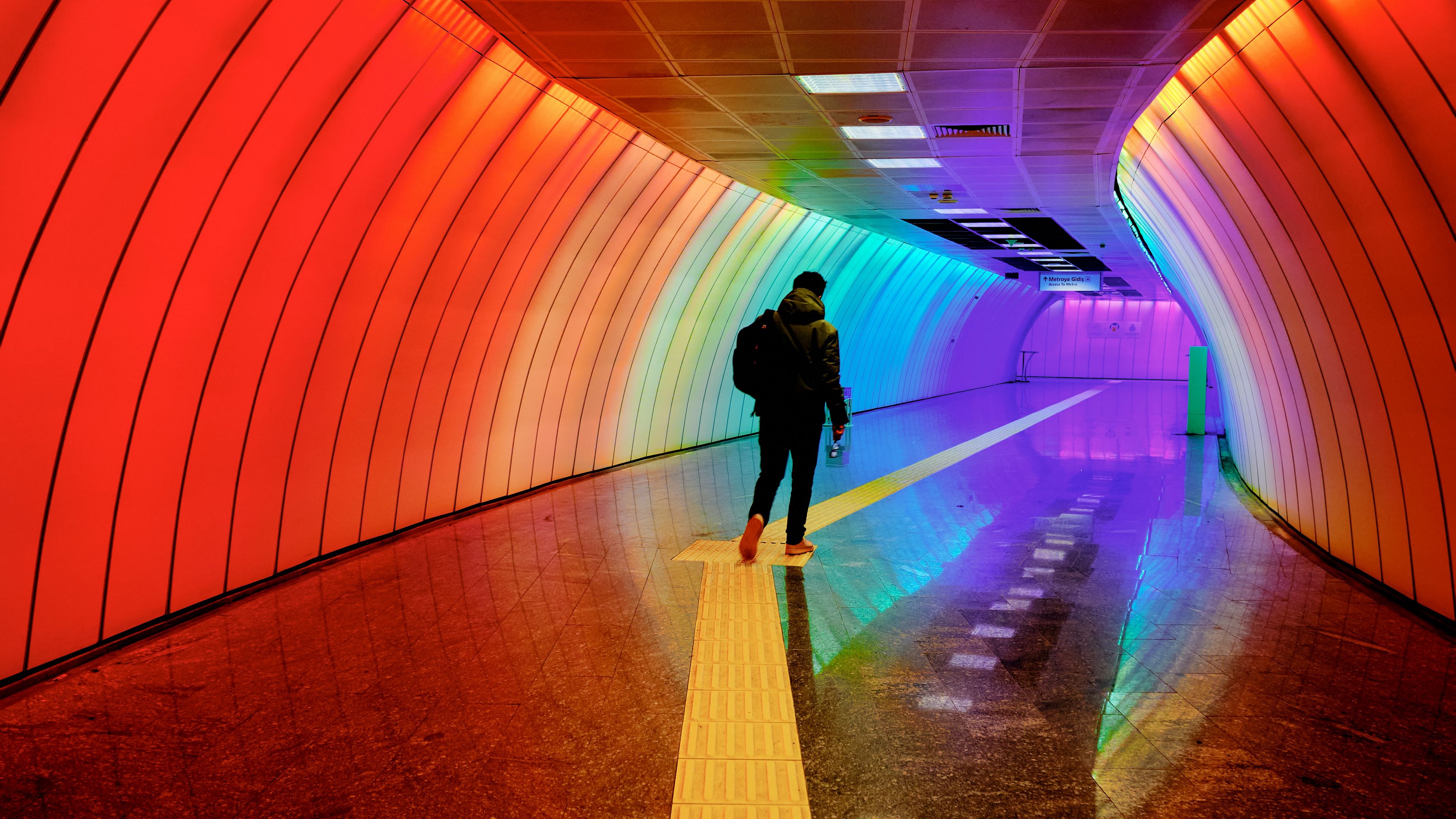 Description: A person walking down a tunnel with a bright light on the ceiling and a long hallway with a red and blue light.
