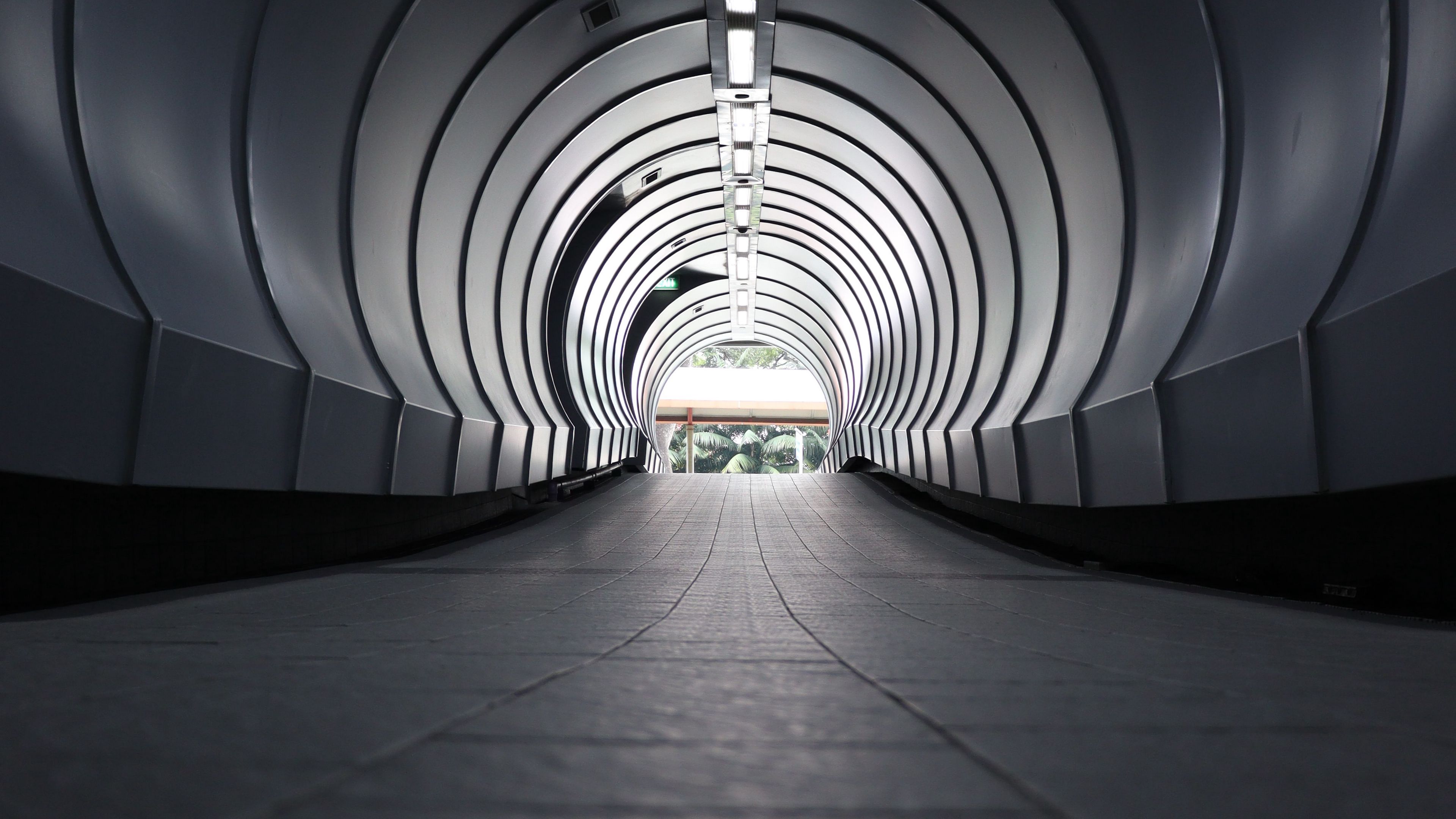 Description: A tunnel with a long walkway going through it with a clock on the wall and a clock on the wall.