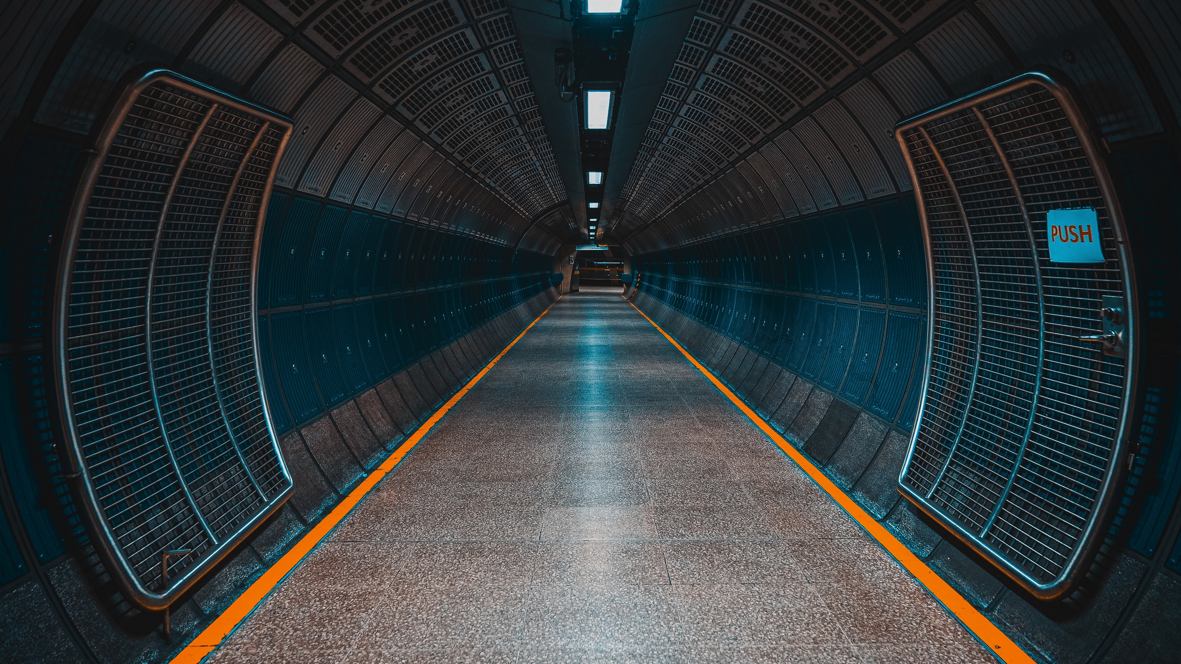 Description: A tunnel with a yellow line going through it and a clock on the wall above it that reads 1 30.