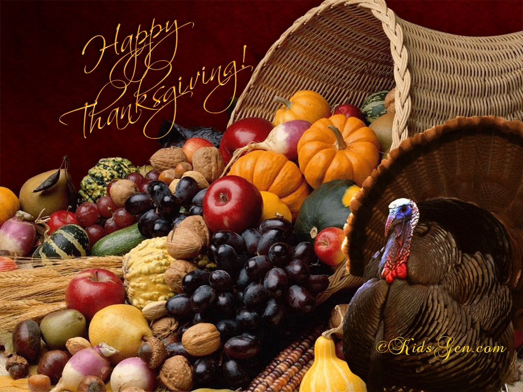 Description: A turkey sitting in a basket of fruit and vegetables with a happy thanksgiving message in the background with a turkey.