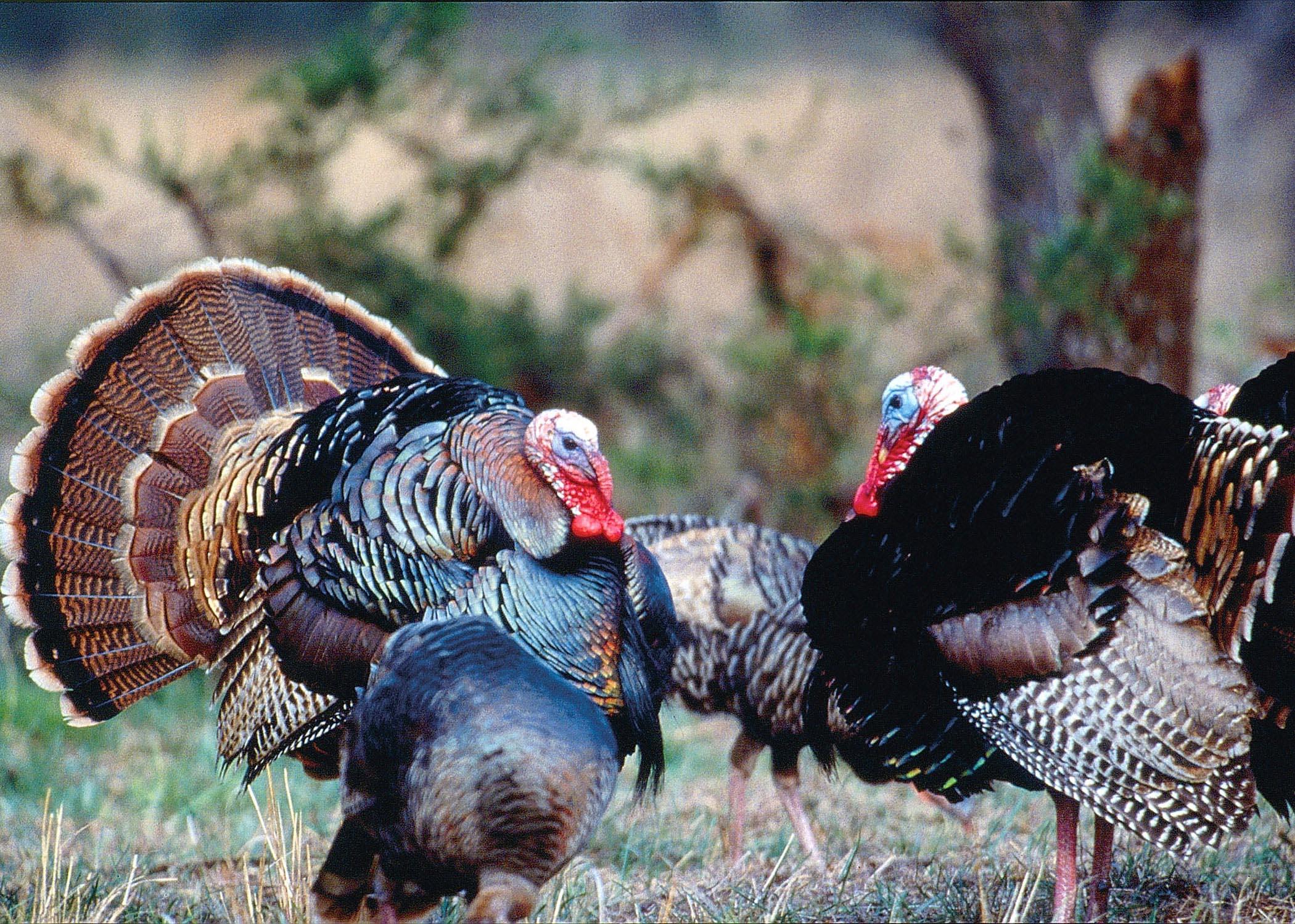 Description: A group of turkeys standing in a field of grass and grass with trees in the background and a brown and green grass area.