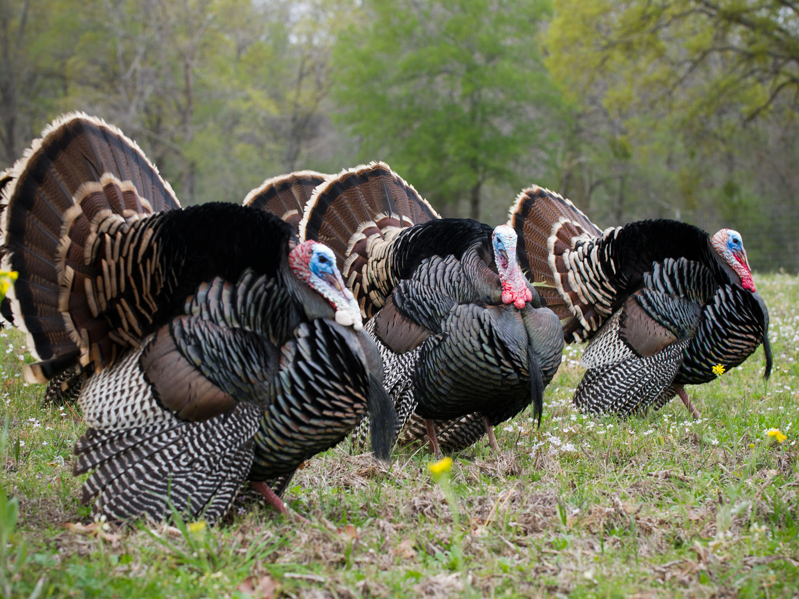 Description: A group of turkeys are standing in a field of grass and flowers.