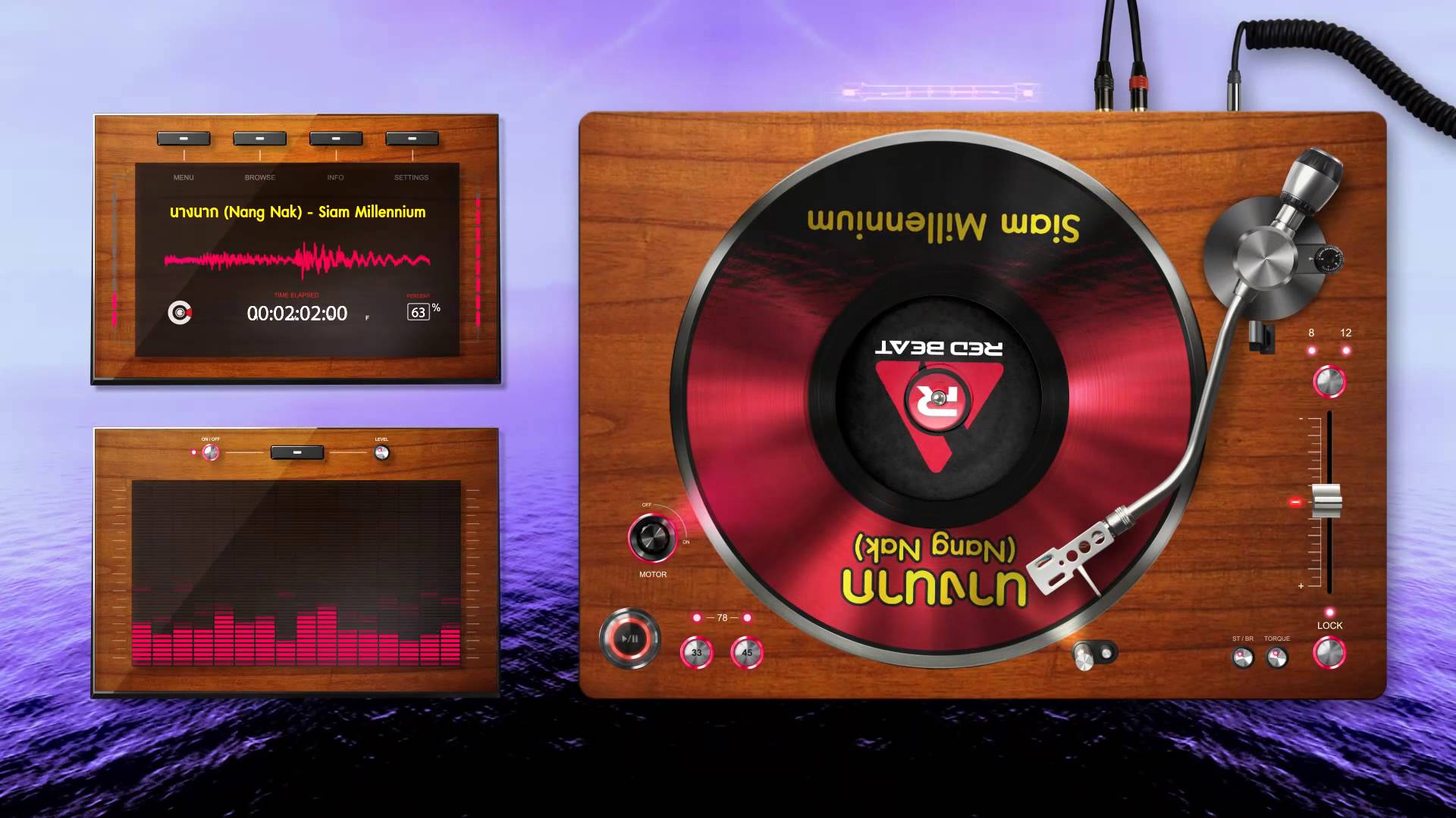 Description: A turntable with a record player and a cd player on it's side and a sound board on the other side.
