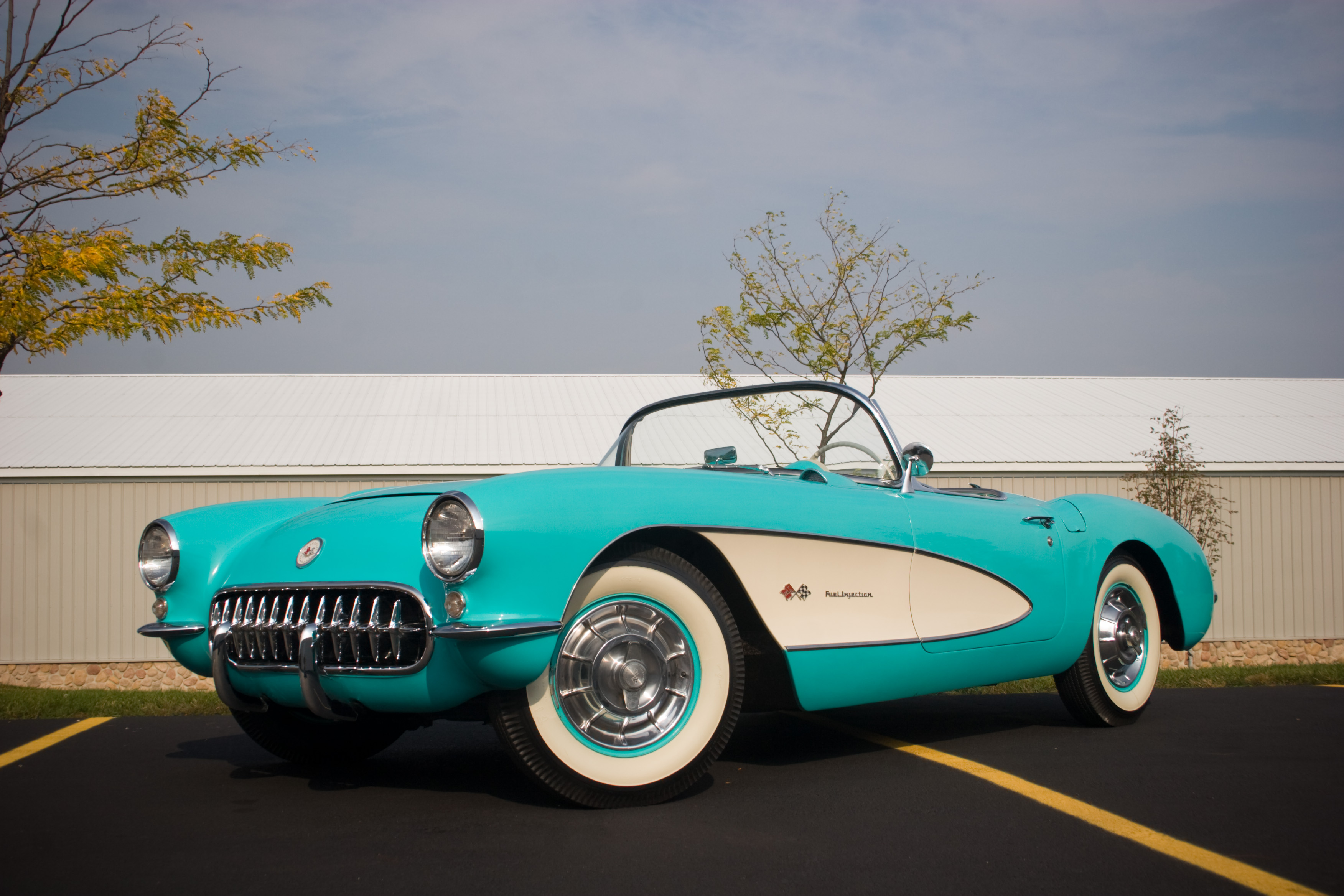 Description: A turquoise and white car parked in a parking lot next to a building with a white roof and a white roof.