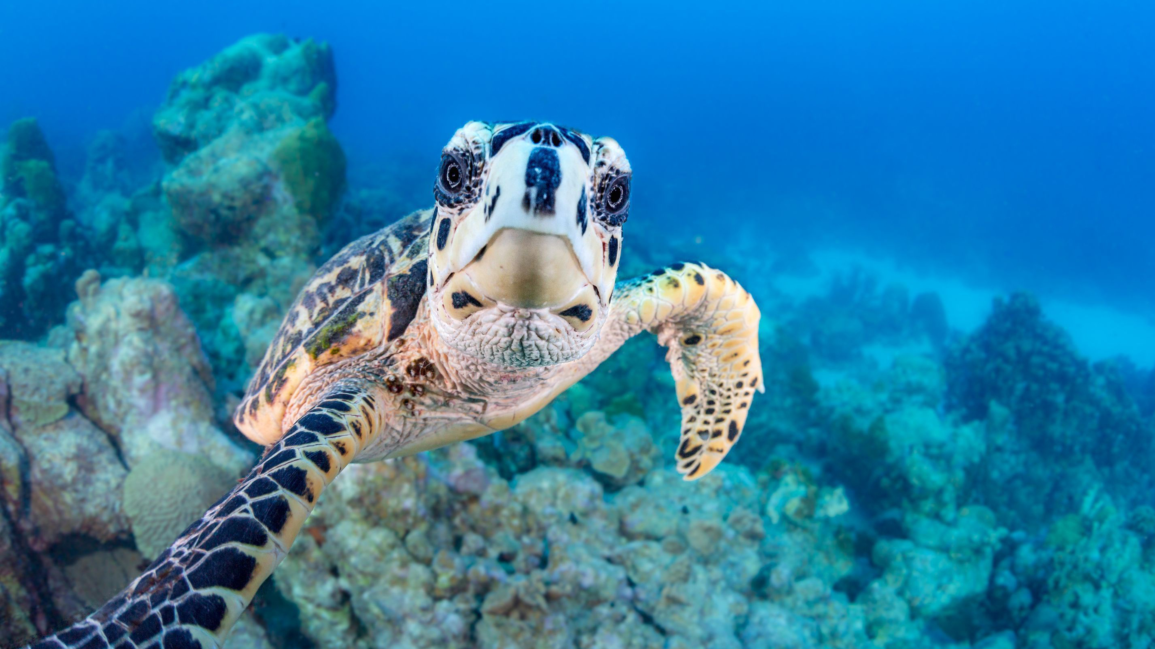 Description: A turtle swimming over a coral reef in the ocean with blue water and corals in the background photo.