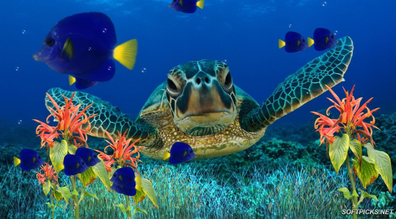 Description: A turtle swimming in the ocean with fish around it's neck and head.