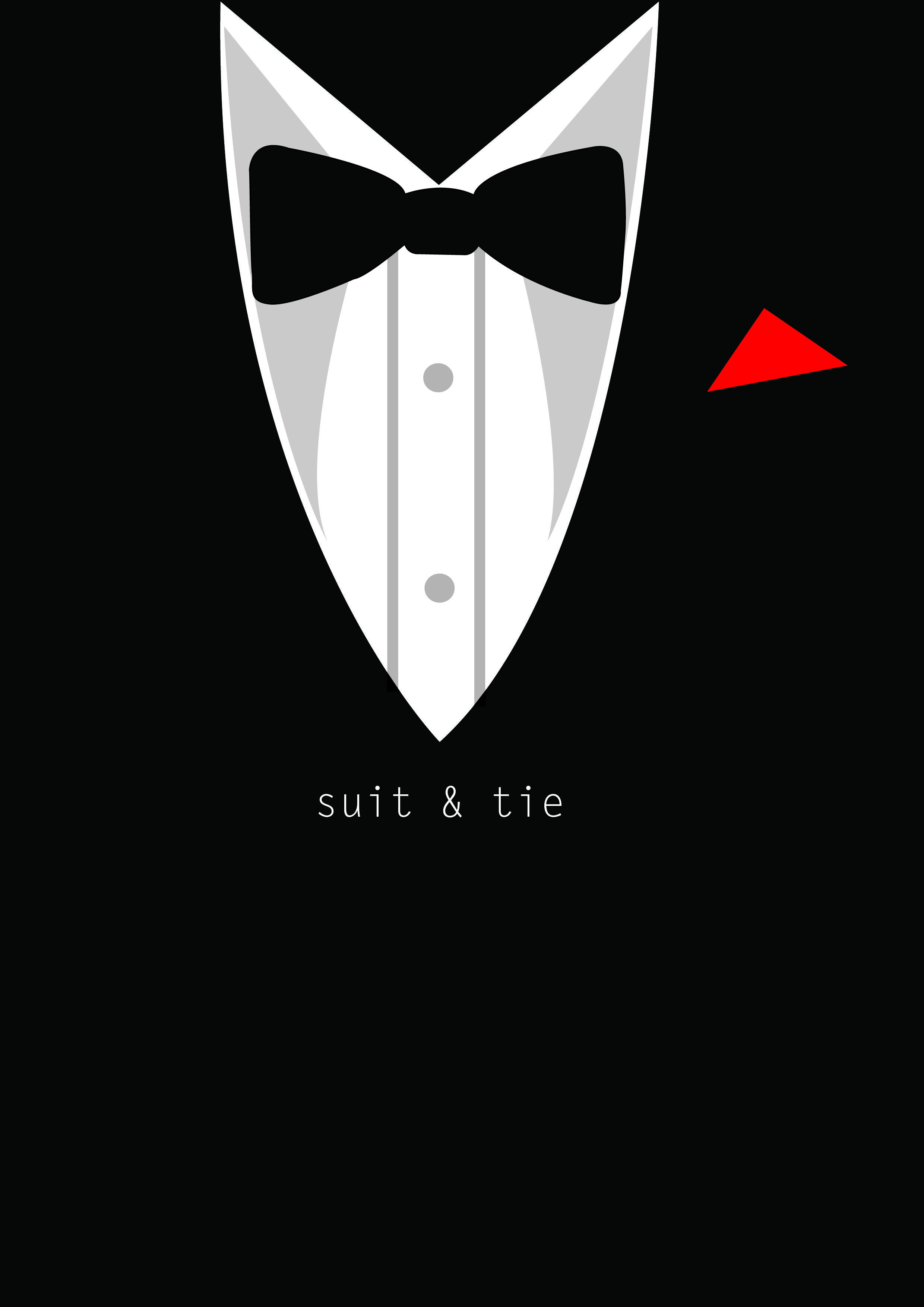 Description: A black and white tuxedo with a red arrow on it's side and the words suit and tie written on the side.