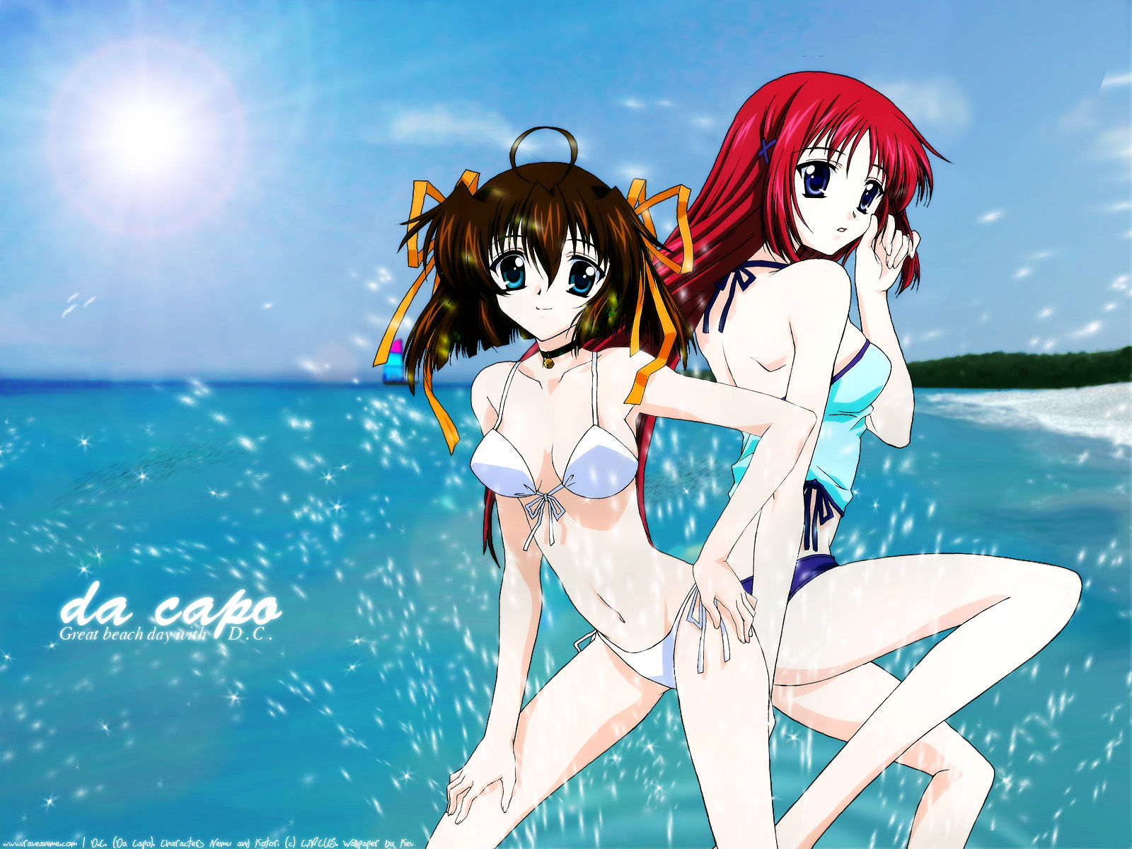 Description: Two anime girls in bikinis are standing in the water near the beach and one is holding a kite.