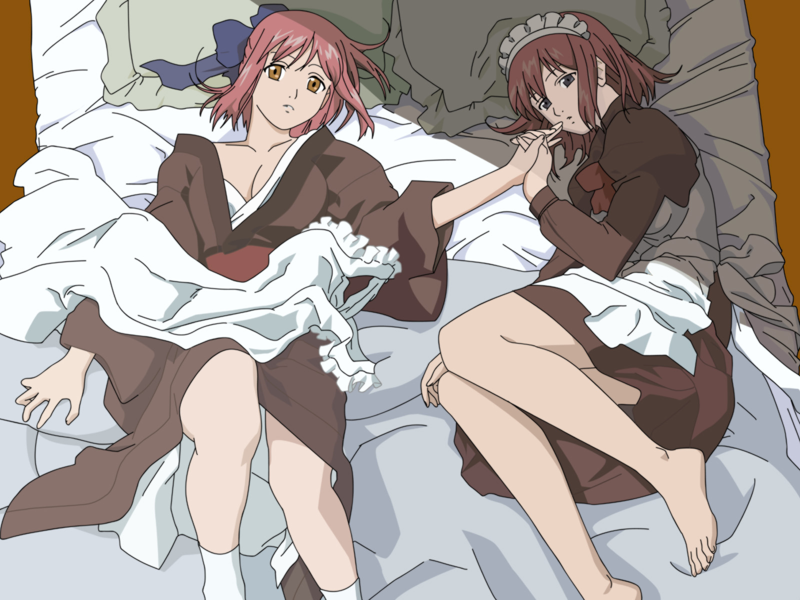 Description: Two anime girls sitting on a bed with pillows and blankets on them.