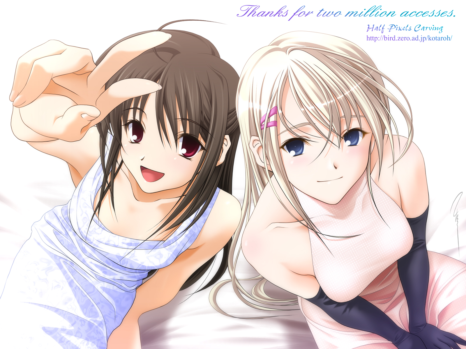 Description: Two anime girls laying on a bed with their arms around each other and a thank card in the background.