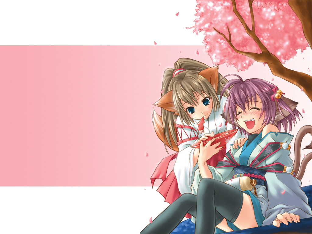 Description: Two anime girls sitting on a bench under a tree with a cat on their shoulder and a cat on their shoulder.