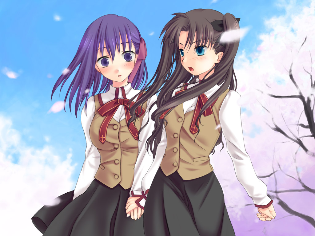Description: Two anime girls with long hair and blue eyes are standing in front of a tree with pink flowers and a blue sky.