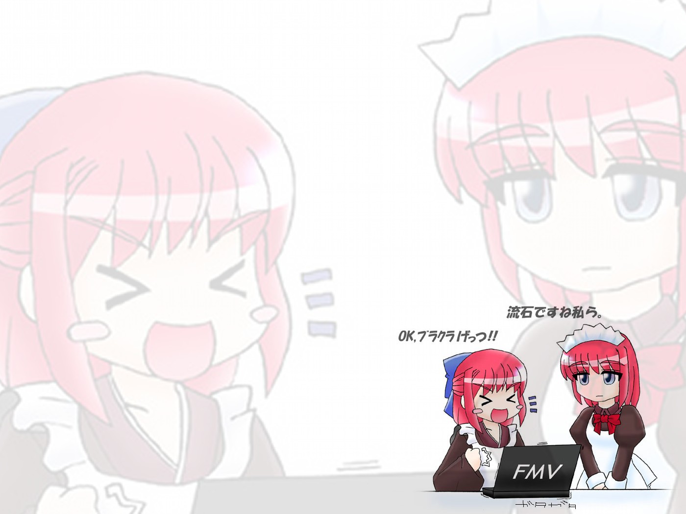 Description: Two anime girls sitting at a table with a laptop computer in front of them.