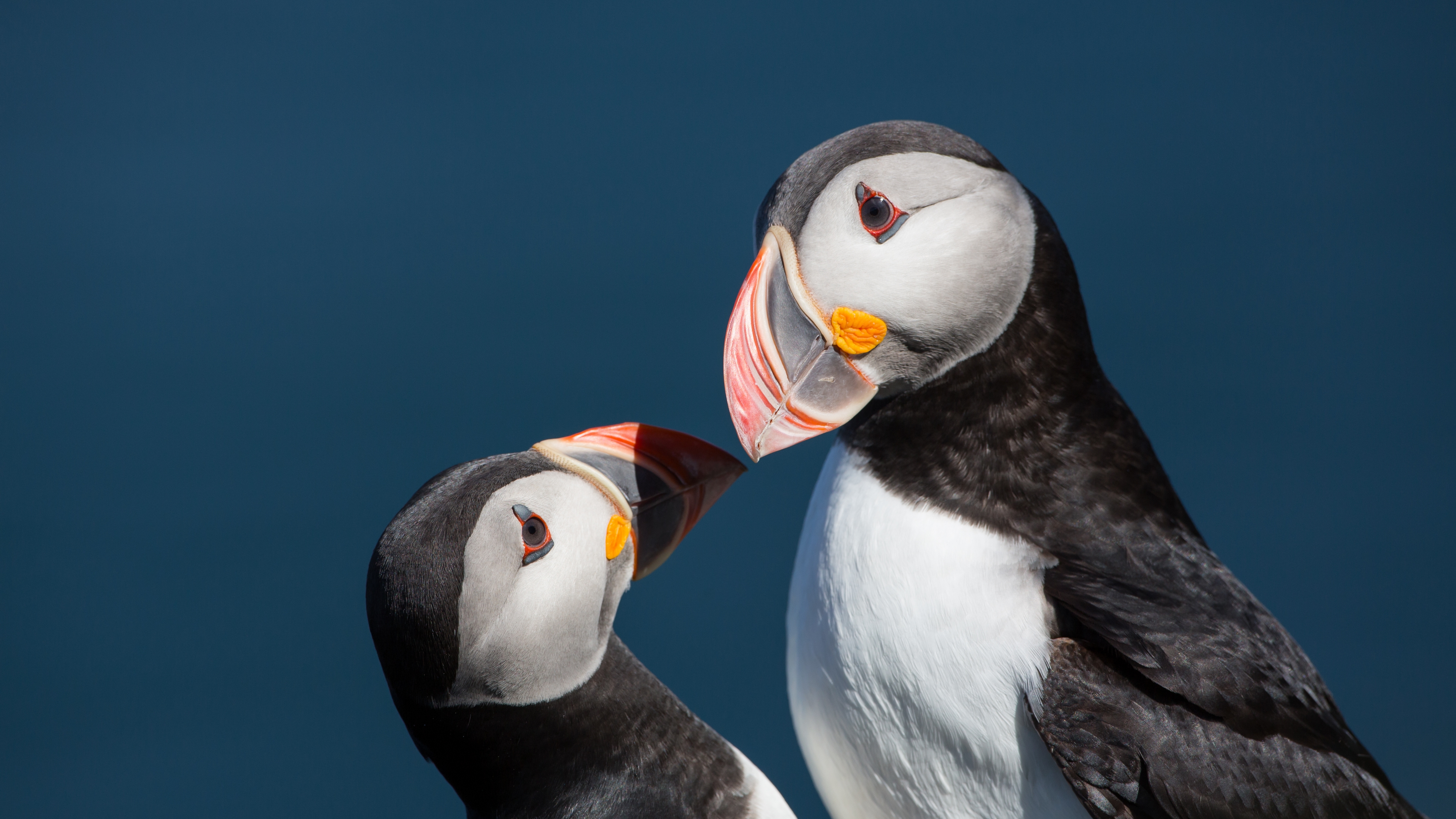Description: Two birds standing next to each other on a blue background with a sky background behind them and one bird with a red beak.