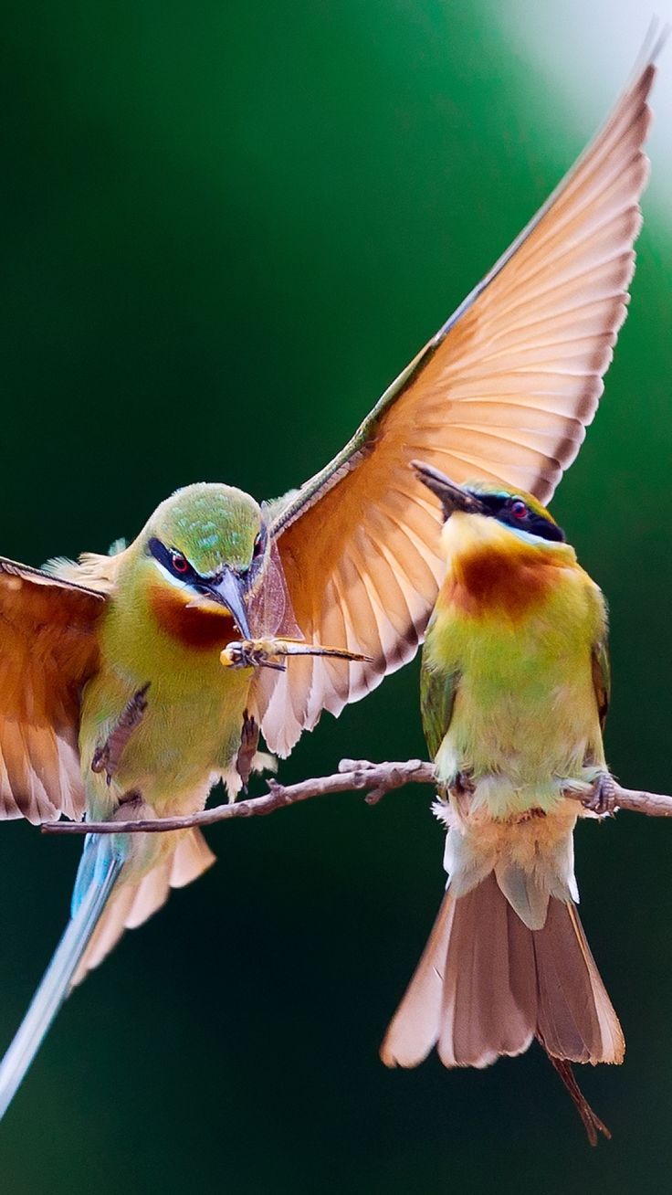 Description: Two birds are sitting on a branch with their wings spread out and one is flying away from the other.