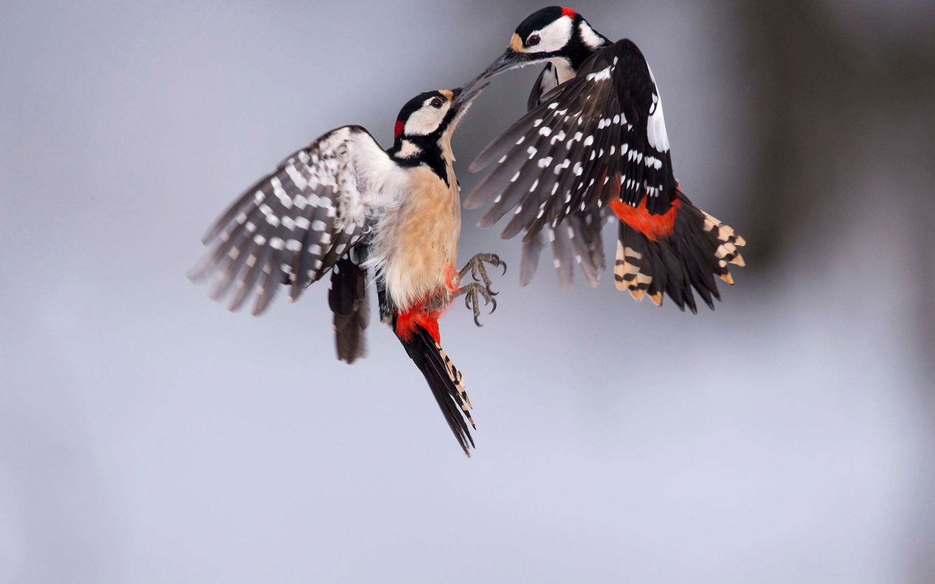 Description: Two birds are flying in the air with their wings spread open and beaks open.