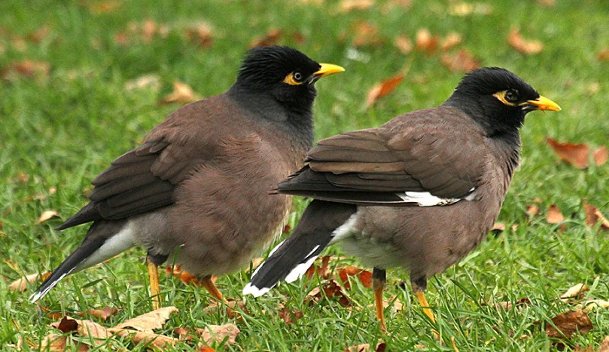 Description: Two birds standing on a grassy field next to leaves and flowers on the ground and one bird is looking at the camera.