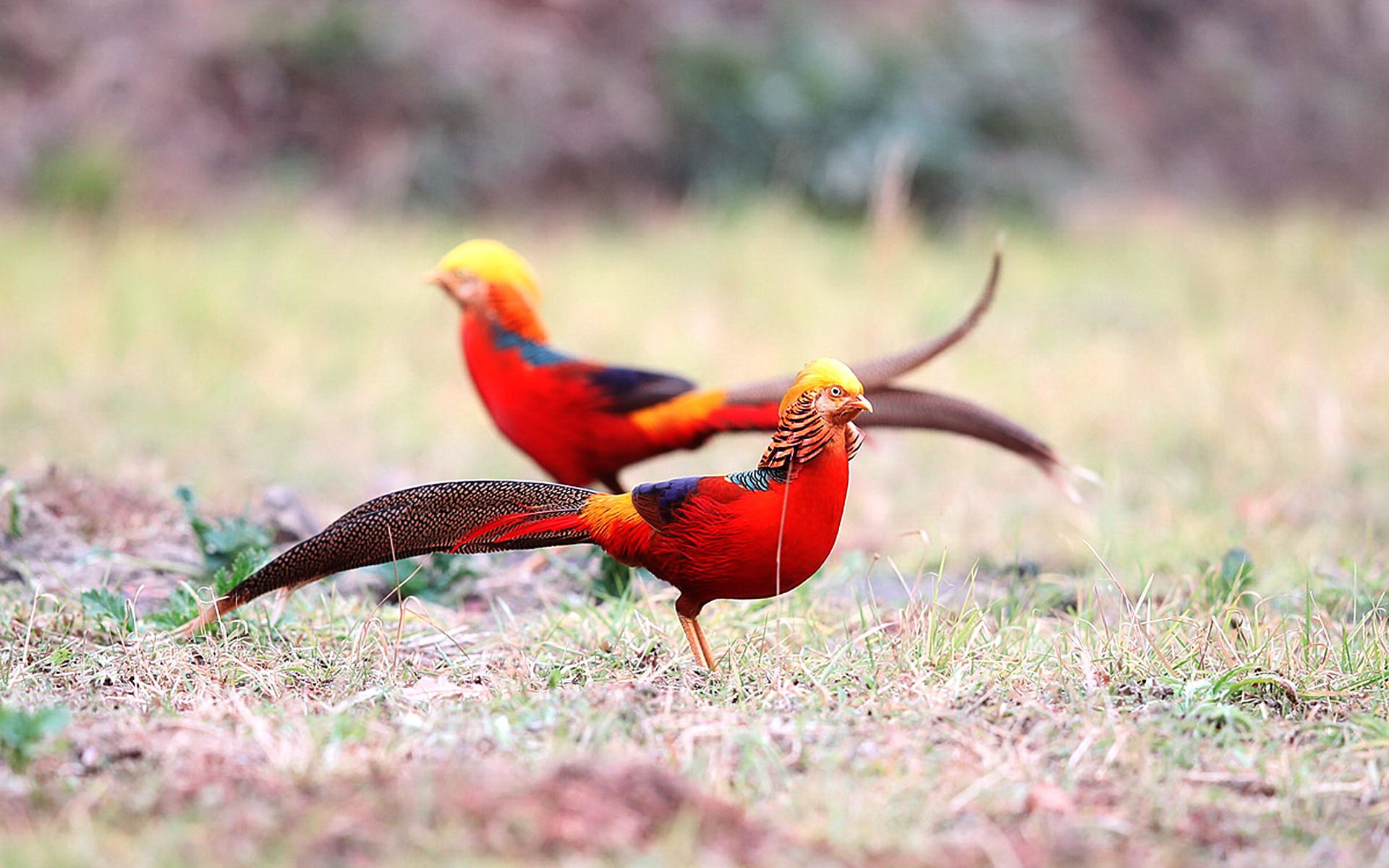 Description: Two birds are standing in the grass together.