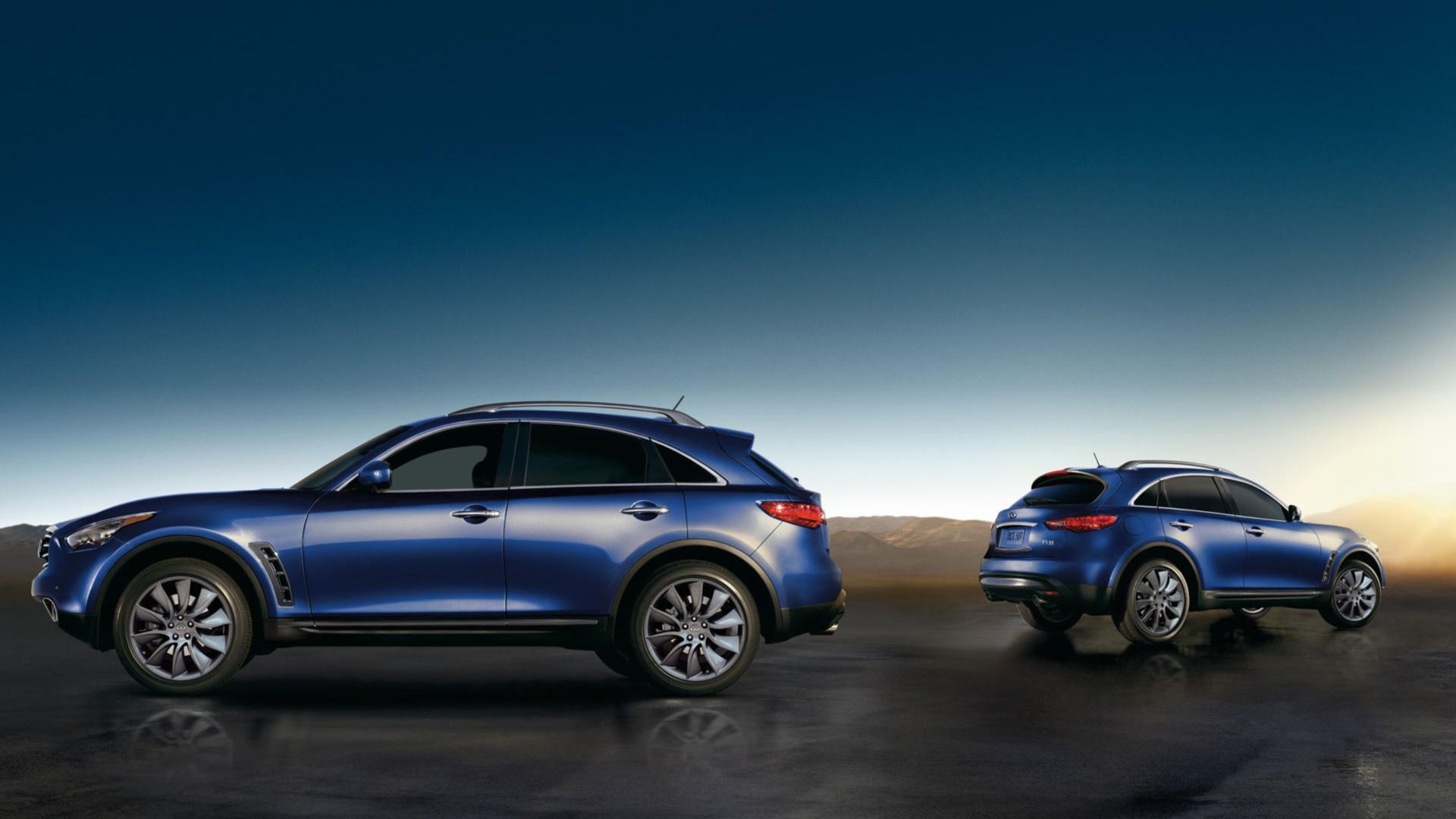 Description: Two blue cars parked in a parking lot at night time with the sun shining on the horizon behind them.