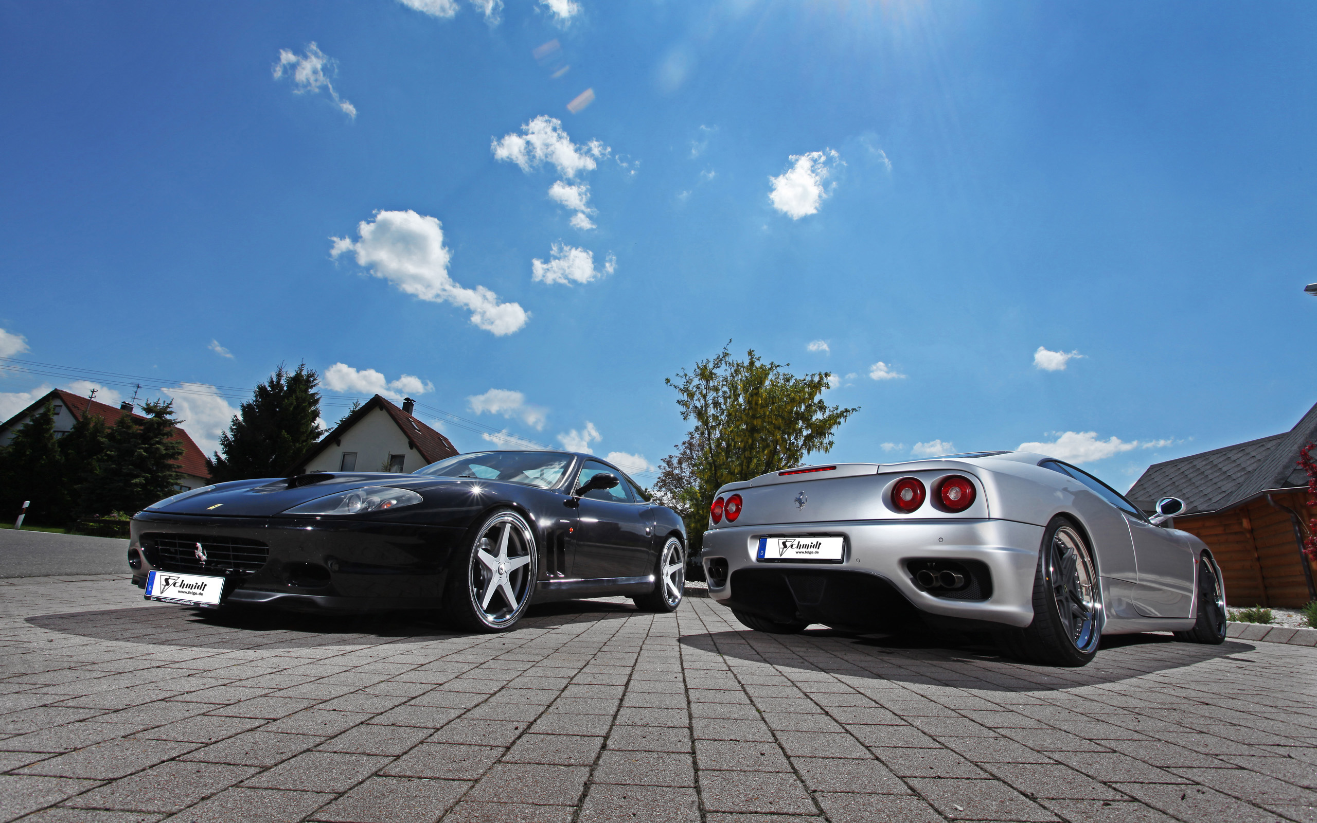 Description: Two cars parked next to each other on a brick road with a house in the background and a blue sky with clouds.