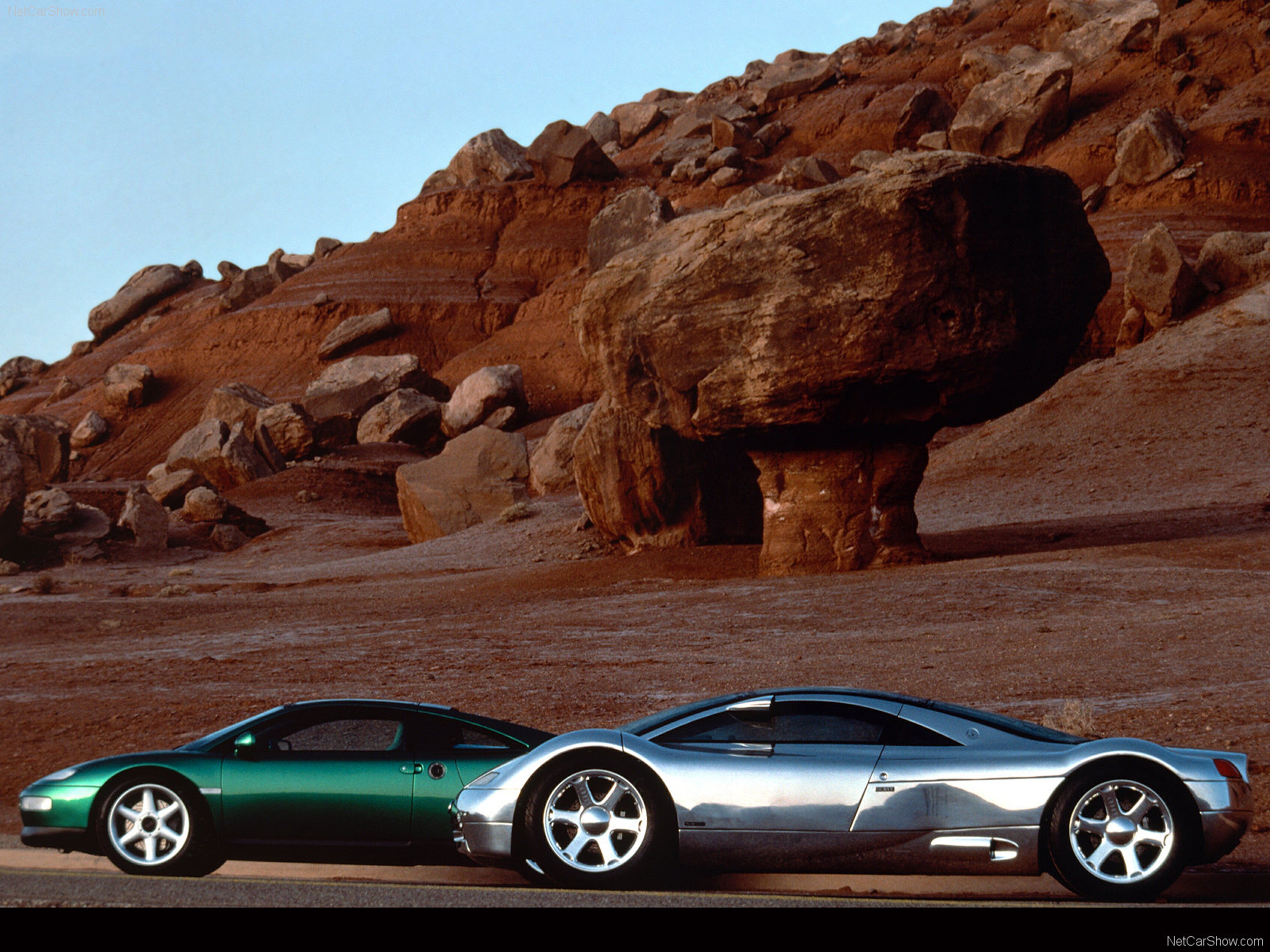 Description: Two cars parked in front of a large rock formation in the desert with a large rock formation in the background.