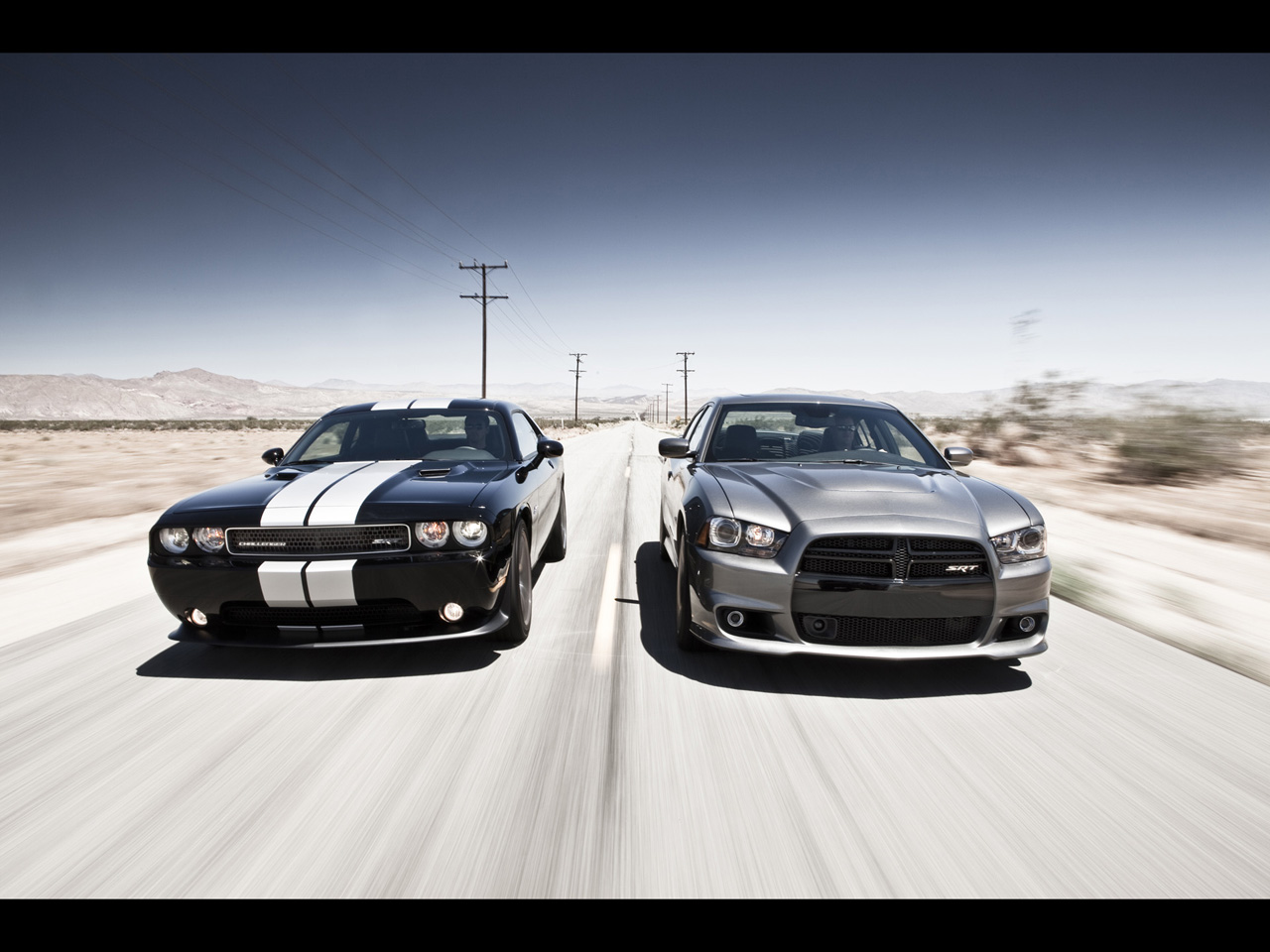 Description: Two cars driving down a road with a sky background and a desert landscape in the background with telephone poles.
